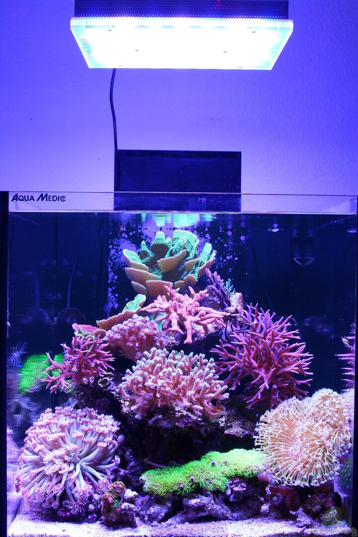 Ich habe das Becken anfänglich nur mit Riffkeramik und den Sangokai Basics gestartet. Die ersten Korallen zogen nach einigen Tagen ein und die meisten SPS nach zwei Wochen. Nach und nach habe ich zur Erweiterung der Biodiversität und für mehr Stellplatz noch etwa 4KG Lebendgestein eingesetzt.