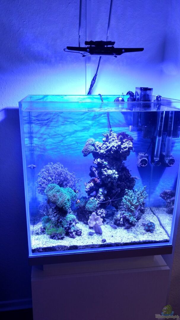 Ich hab hier mein bestehendes und sehr gut eingefahrenes Süsswasserbecken auf Meerwasser portiert. Zuerst nur mit einem Innenabschäumer der Fa. Tunze (9004) und zwei Strömungspumpen. Der Abschäumer wurde verkleinert (Tunze 9001) und dann kam eine vernunftige LED und eine Füllstandsregelung dazu. Die überarbeite ich derzeit und installiere eine Arduino gesteuerte Ultraschallabfrage sowie ein mini Au??enbecken.