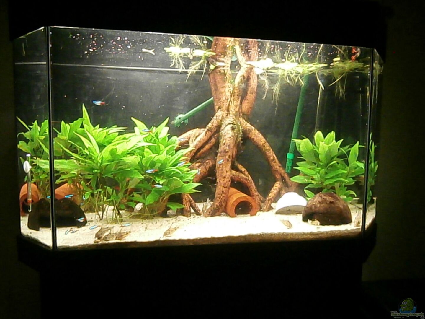 Ein schon etwas älteres Juwel Panorama 130, welches eine Sechseck Form besitzt. Frontscheibe misst 60 cm. Passender Juwel Unterschrank Originaler Innenfilter wurde entfernt. Damit man nicht die Wand im Hintergrund sieht, wurde schwarze Pappe als Hintergrund hinter das Aquarium geklebt.