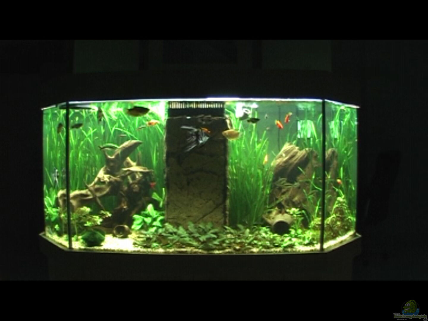 Das Aquarium ist eine Sonderanfertigung als Achteck (Raumteiler) in Eiche.