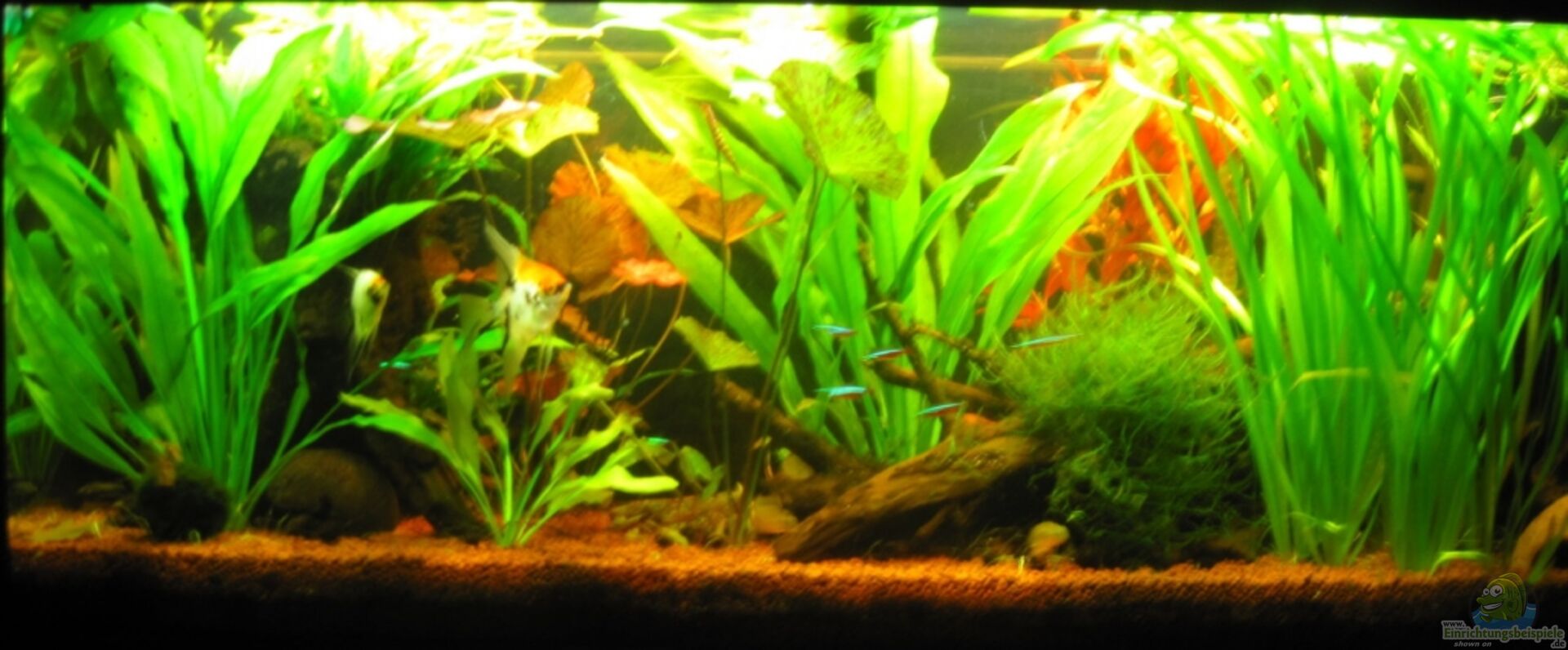 Typ: Juwel Rio 240. Das Becken steht als Raumteiler zwischen Wohn- und Essbereich. Es kann von 3 Seiten eingesehen werden, was die Gestaltung ziemlich erschwert, da es ja von allen Seiten einigerma??en gut aussehen soll. Eine Seitenwand (die an der Wand steht) wurde an der Innenseite des AQ mit "Struktur- Rückwand" von Juwel beklebt.