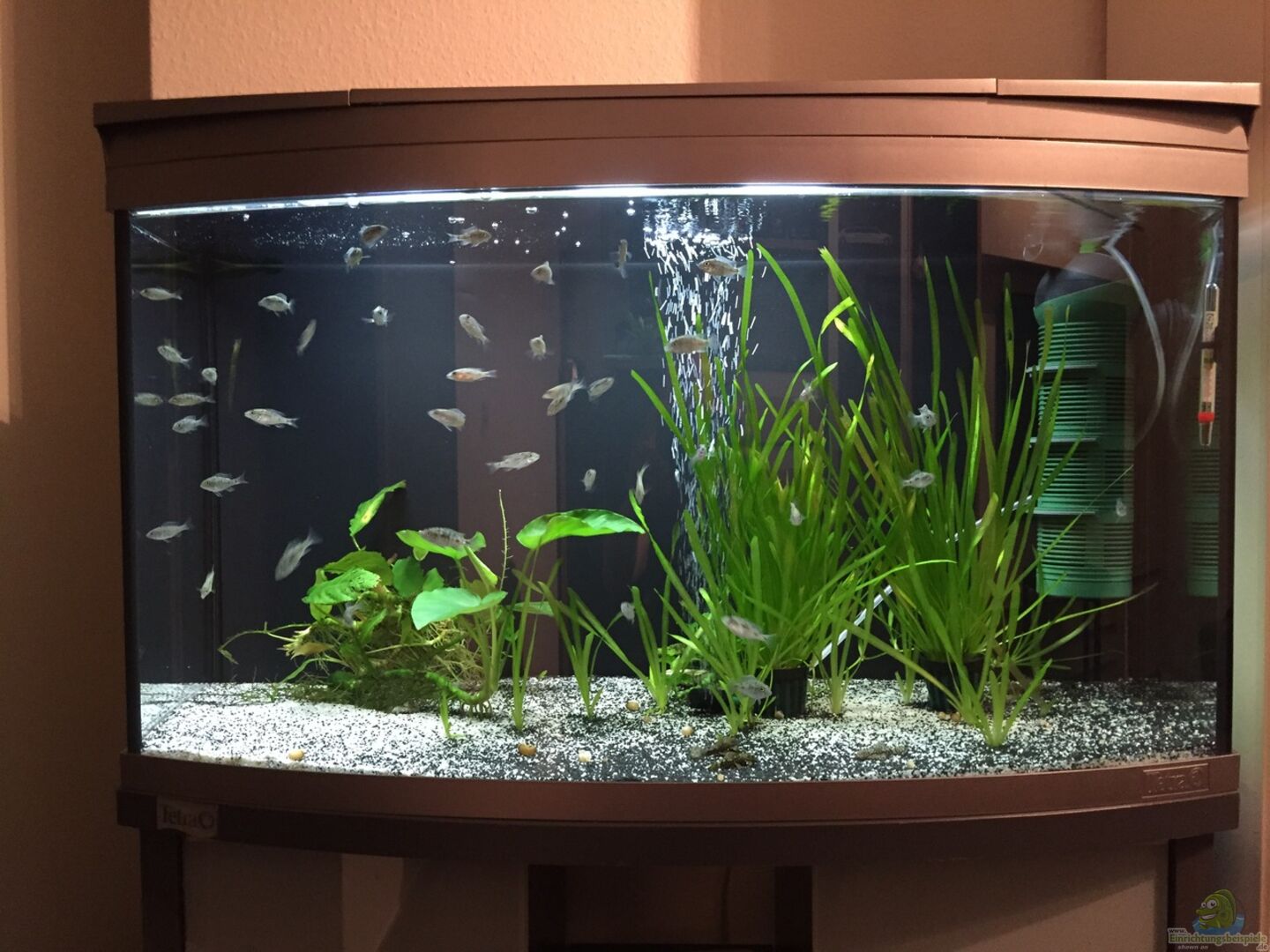 Tetra AquaArt Evolution Line mit Standard Beleuchtung. Dieses Becken dient als Quarantäne/Aufzucht und Pflanzenregenerations-Becken je nach dem was gerade ansteht. Aktuell sind Aulonocara Junge zur Aufzucht im Becken.