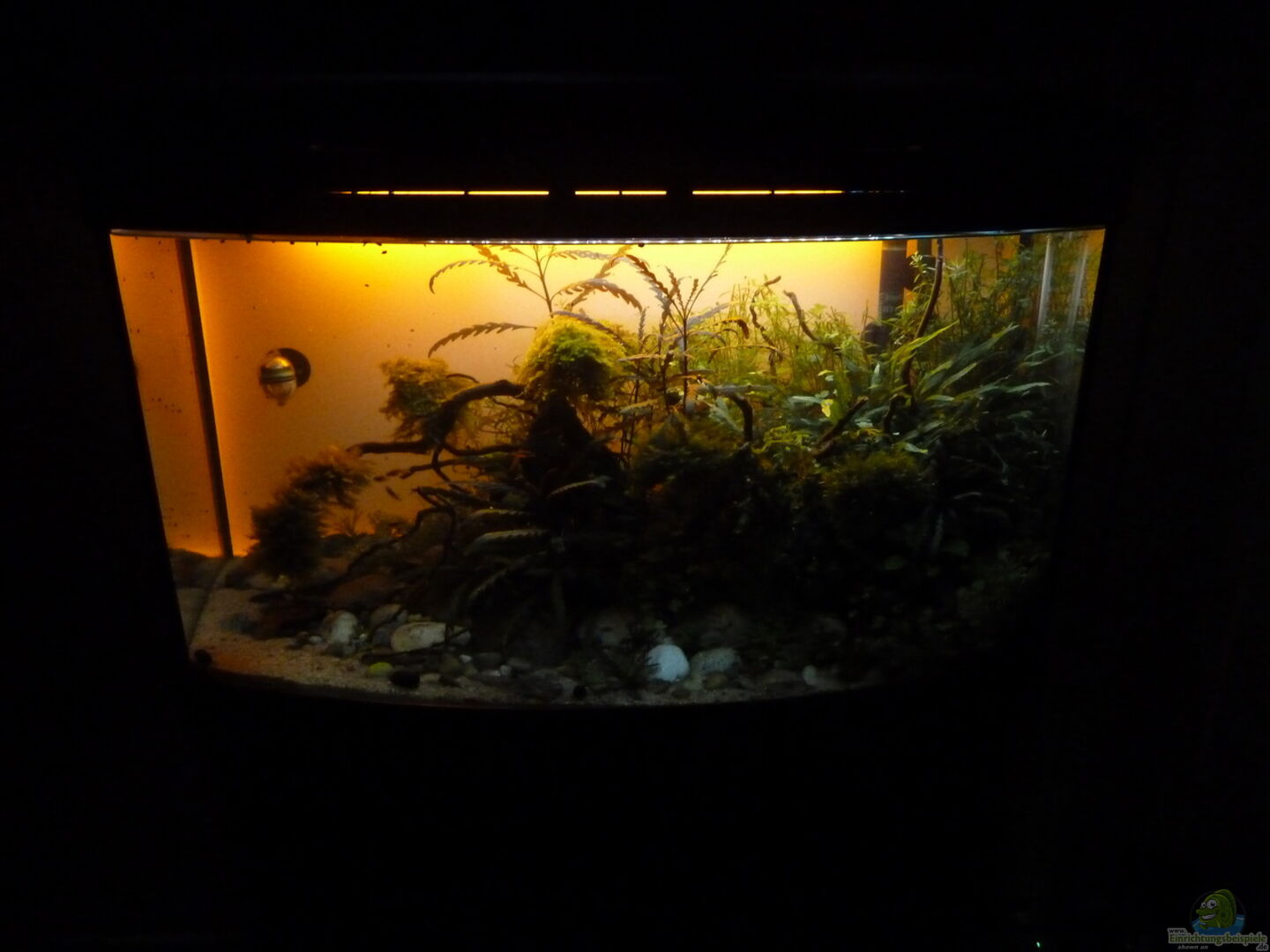 Becken hat eine gebogene Frontscheibe. Aufgrund dessen hat es lediglich 100 Liter. Hintere Scheibe wurde mit Milchglasfolie beklebt. DIY Hintergrundbeleuchtung mit Sonnenauf- und Sonnenuntergang.