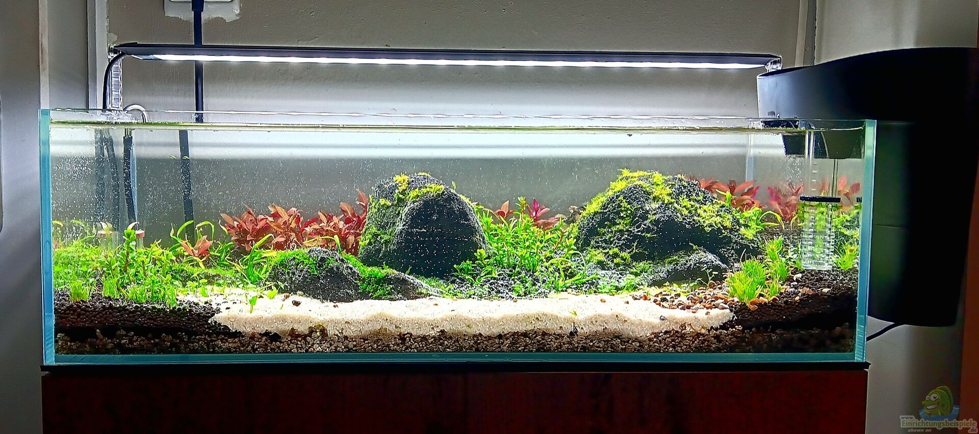 Flaches Aquarium mit mehr Grundfläche als Höhe; Versuche hier erstmals die Dry-Start-Methode. Die Pflanzen werden ca. 4 Wochen anwachsen bevor es komplett geflutet wird.