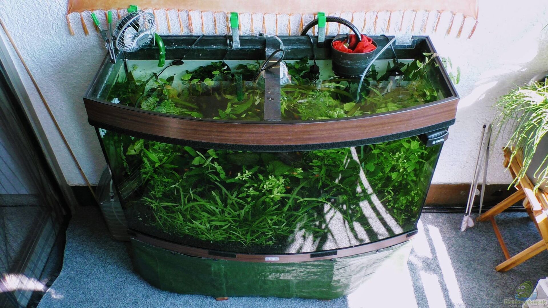 AUFGELÖST! - Das Becken wurde ende 2018 bei stark sinkenden Außentemperaturen aufgelöst. Die sich bis dahin stark vermehrte Biomasse in Form von Pflanzen wurde genutzt um das neue 4000 Liter Aquarium eines Freundes damit auszustatten. Das Becken steht auf meinem Balkon und wird mit einem Bodenfilter betrieben. Über eine externe Temperatursteuerung stelle ich sicher, dass die Temperatur nachts nicht zu sehr absinkt, tagsüber nicht zu weit ansteigt (Kühlung per Ventilator/Verdunstungskälte). [...]
