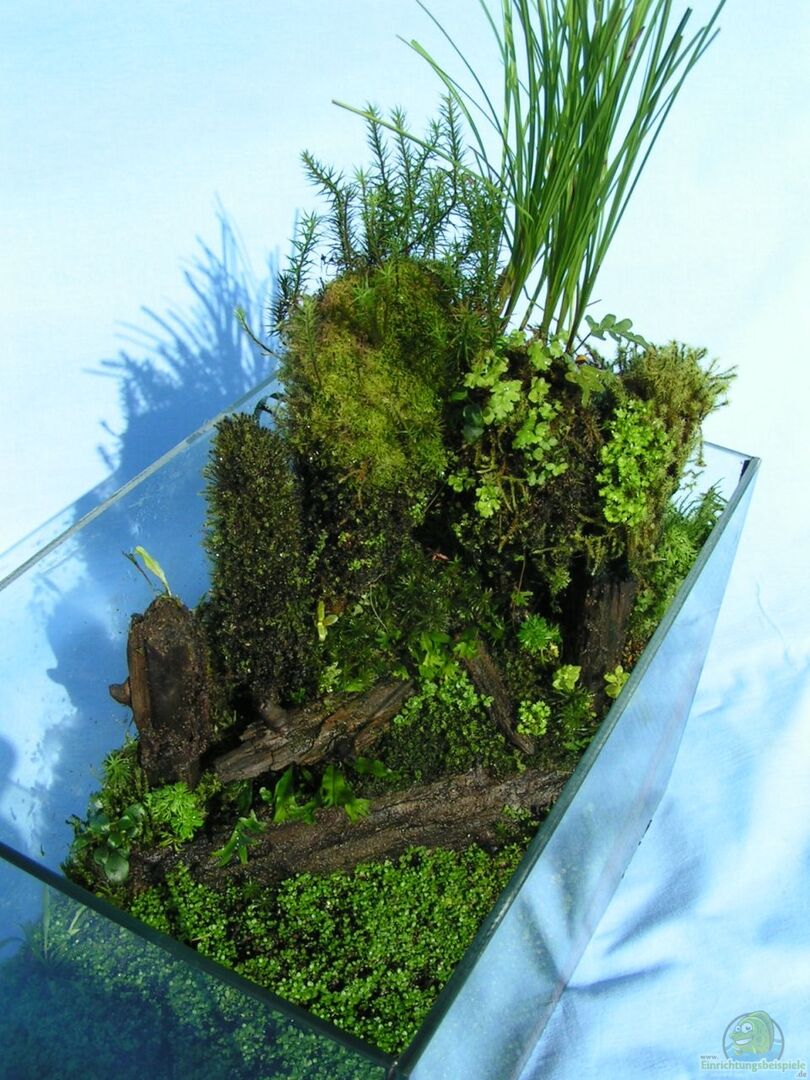 Hallo, das besondere an diesem Becken ist, dass es OHNE WASSER läuft. Tatsächlich besteht es aus zwei 12l Becken die aufeinander stehen. Darin habe ich ein Millieu geschaffen in dem Aquarienpflanzen und Moose gut emers also "über Wasser" im Gegenteil zu submers "unter Wasser" wachsen können.