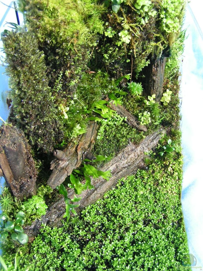 Hallo, das besondere an diesem Becken ist, dass es OHNE WASSER läuft. Tatsächlich besteht es aus zwei 12l Becken die aufeinander stehen. Darin habe ich ein Millieu geschaffen in dem Aquarienpflanzen und Moose gut emers also "über Wasser" im Gegenteil zu submers "unter Wasser" wachsen können.