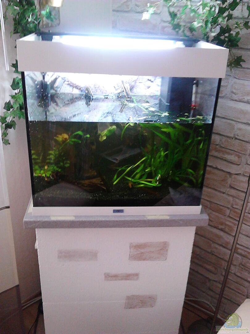 Juwel Lido 120 auf selbst gebautem Unterbau und mit aufgeklebter Fotorückwand "Felsen"