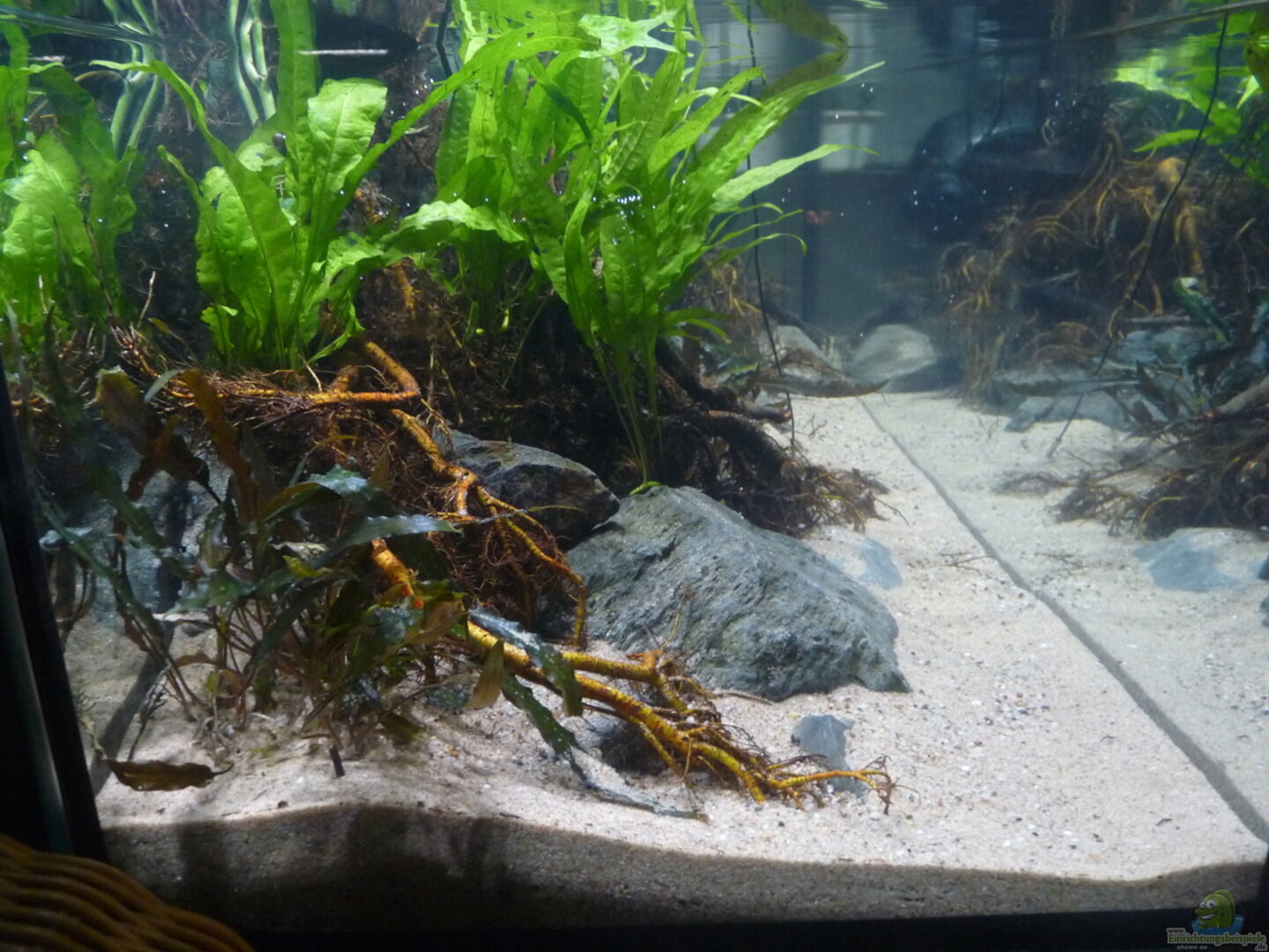 Standardbecken, welches ich günstig erstanden habe. Wasserstand beträgt nur 30cm. Abdeckung mittels Glasscheiben. Rückwand ist einfache schwarze Pappe aus dem Bastelladen.