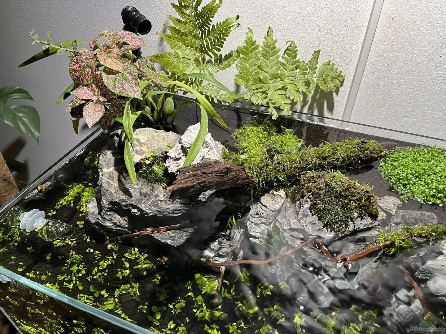 Flaches Poolbecken aus Weisglas von "UNS Aquarium" mit Uferzone und emersen Pflanzenbereich. Steinaufbau trennt das Becken in Wasser- bzw. Uferbereich. Unterschrank ist ein Liquid Garden Premium Cabinet. Graue Schläuche, da ich sie einfach optisch schöner finde. Edelstahl Inline Diffusor