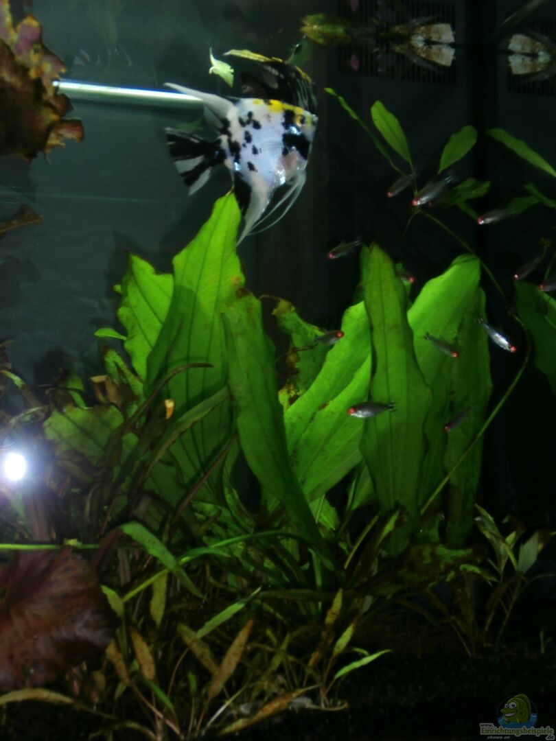 Keine Besonderheiten. Es handelt sich um ein einfaches Juwel Rio 400 mit passendem Juwel Unterschrank SB 155 in Schwarz. Auf eine Rückwand wurde bewusst verzichtet, um keinen Schwimmraum zu verlieren. Damit man nicht die wei??e Wand im Hintergrund sieht, wurde schwarze Pappe als Hintergrund hinter das Aquarium geklebt.