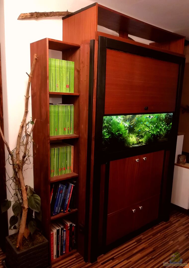 Die Besonderheit bei diesem Aquarium ist das blaue Loch in der Mitte. Man schaut durch das Becken hindurch in den Kellerabgang. Die gegenüberliegende Wand entlang der Kellerstiege wurde mit einer passenden Fototapete versehen. Der Boden der Mauer vom Durchbruch ist mit einem Diorama verschönert, mit Moos aus dem Wald, Holz, Schiefersteinen und passenden Plastikpflanzen. Durch diesen optischen Trick, glaubt man, dass dieses Becken extrem tief hinein führt. Das Ganze hört aber in Wirklichkeit schon [...]