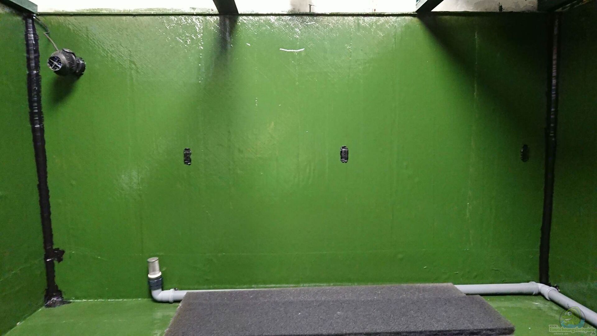 Das Becken besteht aus GFK und einer Frontscheibe. Ein Kellerraum ist durch die Frontscheibe abgetrennt worden und dahinter wurde dann mit Glasfasermatten und Epoxidharz das Becken gebaut. Die Filterung steht oberhalb des Beckens und besteht aus zwei 130cm Filterbecken.