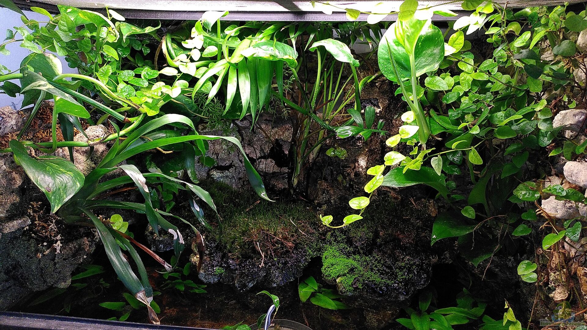 Aquaterrarium ExoTerra Die Silikonnähte im Wasserteil wurden zusätzlich mit Silikon nachgezogen, da werksseitig nicht ganz wasserdicht. Anschließend wurde der Innenausbau auf Basis von Styropor gestaltet. Der Landteil steht auf Säulen aus PVC-Rohren, beklebt mit Styroporstücken. Auf Höhe des Wasserspiegels wurden "Plateaus" gestaltet, auf denen Moos wachsen soll. Im hinteren Bereich wurden zudem durch schräg zum Boden verlaufende Styroporplatten Pflanzbereiche sowie Platz [...]