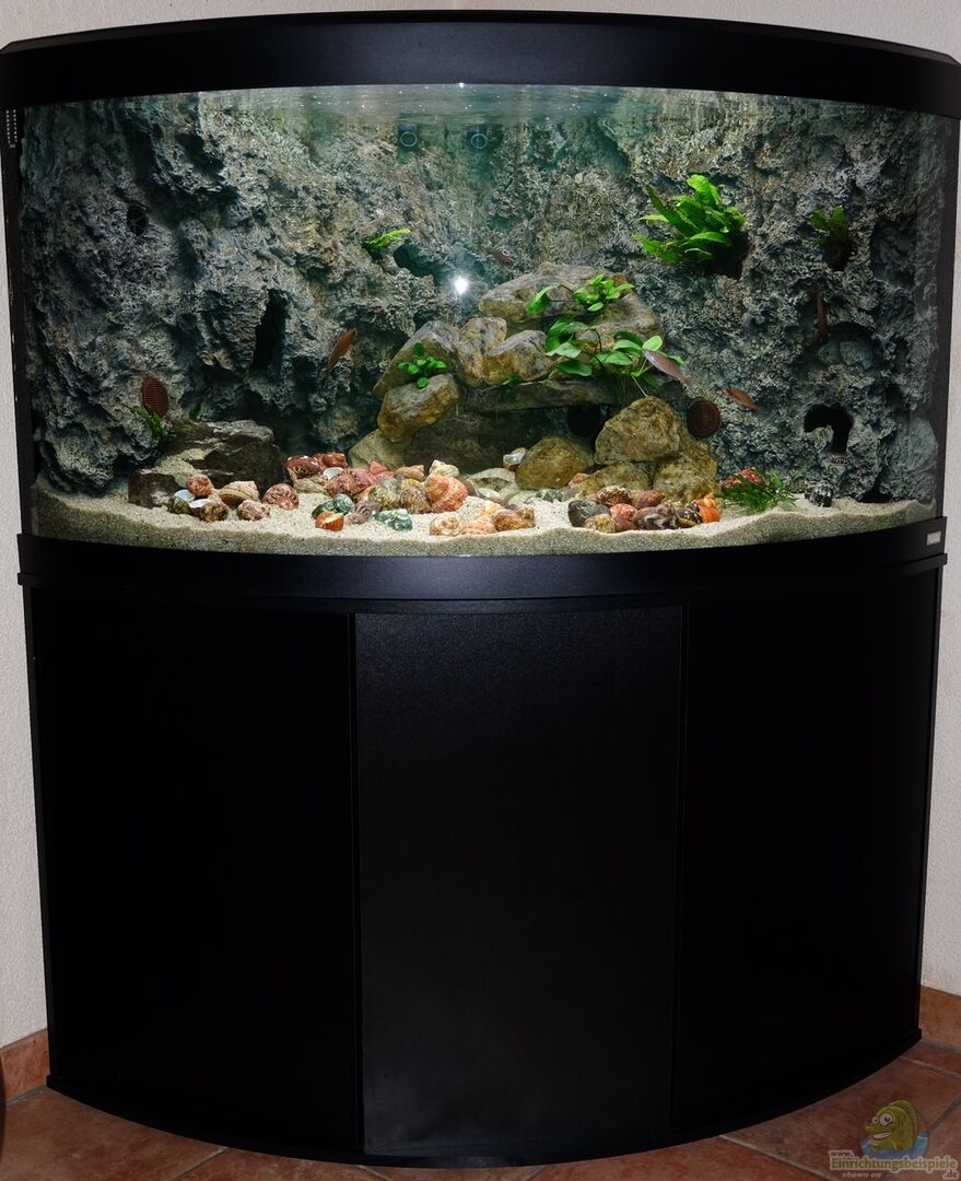 - Eckaquarium (Fluval Venezia 350) - gebogene Frontscheibe - Glasdurchführung für Au??enfilter - Rückwand von Steinzeit (Barsch-Rückwand mit Höhlen)