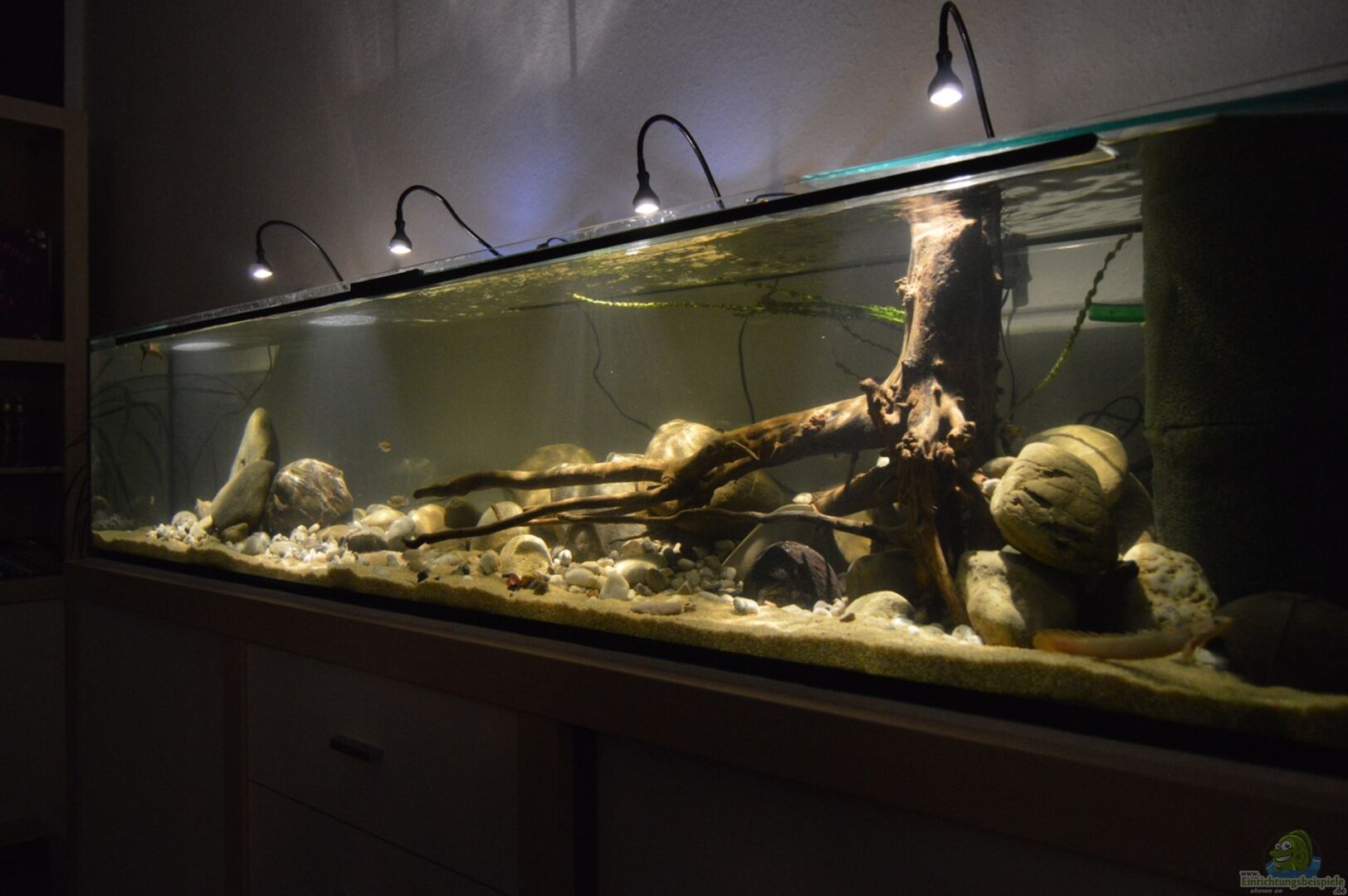 Dieses Aquarium hat ein Sonderma?? mit 200x40x40cm. Bewusst wählte ich dieses Ma??, da hier wunderbar ein schnellflie??ender Bachlauf imitiert werden kann. Es ist durchaus nicht üblich eine so geringe Tiefe und Höhe zu wählen, wer jedoch einmal Spa?? daran gefunden hat, will es nicht mehr missen. Die Tiere sind beinah alle mit 10-15cm ausgewachsen ausgenommen der Flösselhechte.