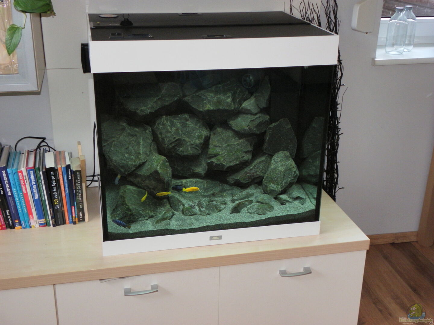ein Juwel Lido 200 in Wei??, ohne original Unterschrank stattdessen auf einem TV-Unterschrank in ahorn/wei?? aufgestellt