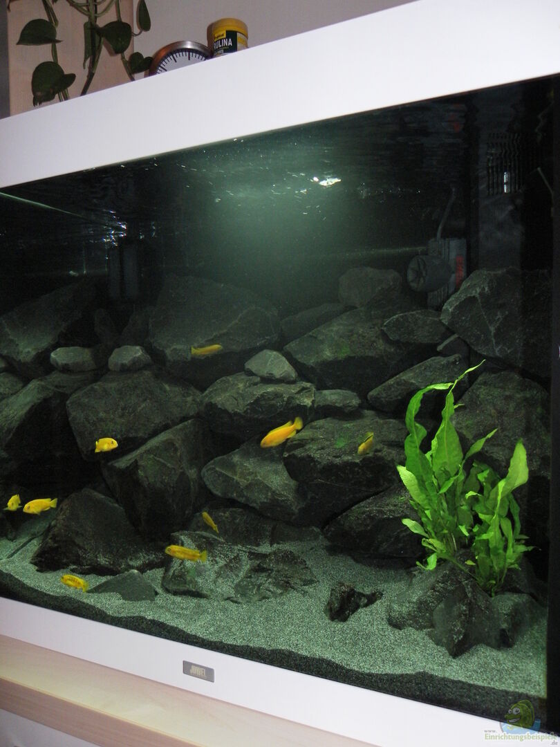 ein Juwel Lido 200 in Wei??, ohne original Unterschrank stattdessen auf einem TV-Unterschrank in ahorn/wei?? aufgestellt