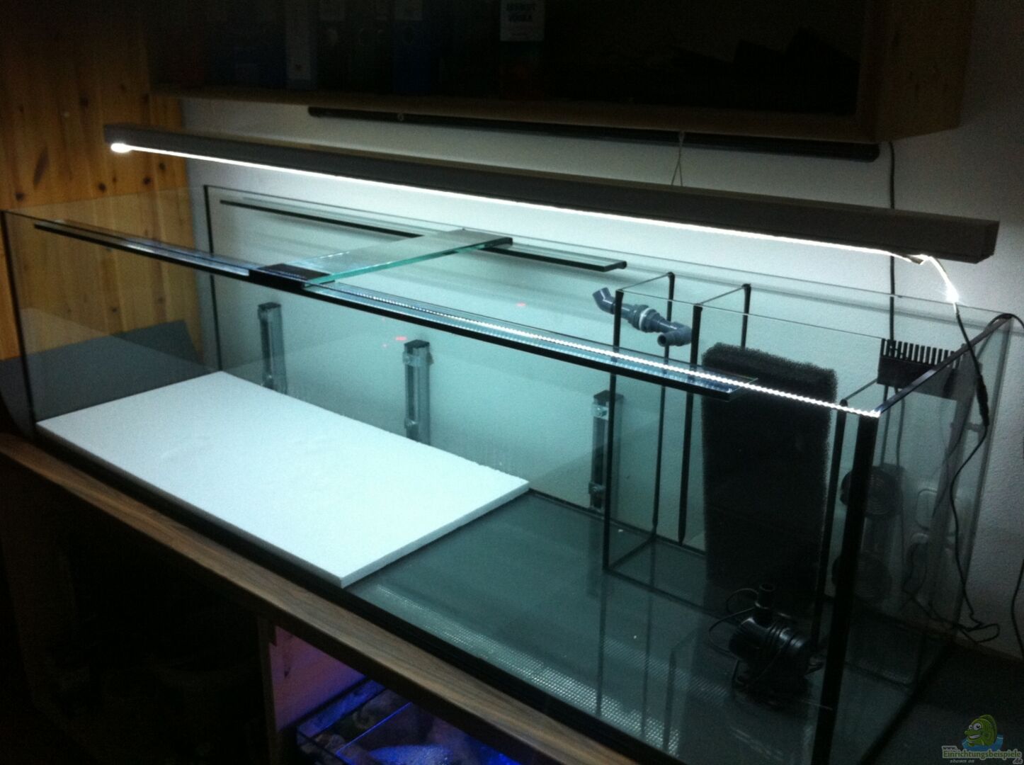 180x50x50 Aqarium mit einer Querstrebe und einem 3 Kammer Innenfilter. 3D Rückwand Marke Eigenbau. Abgedeckt ist das Aqua mit einer Plexiglasscheibe. Unterschrank selbst gebaut aus 3 Schichtplatten und einer Küchenplatte. Verdeckt wird es durch einen Vorhang. Unten steht ausserdem noch ein 112 Liter Becken.