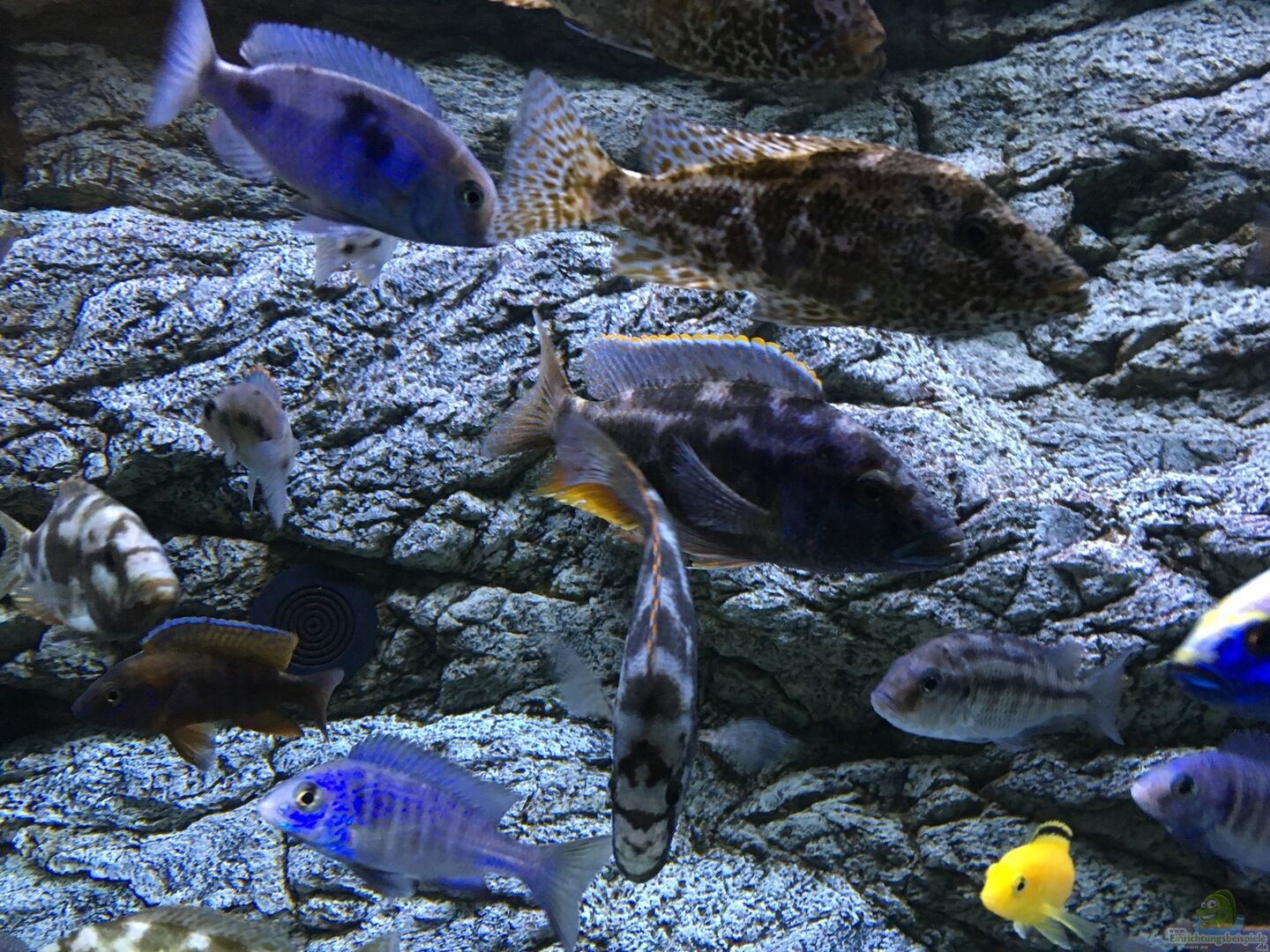Hier findest Du traumhaft schöne Aquarien, die mit Buntbarschen der Art Nimbochromis polystigma (Vielfleckmaulbrüter) aus dem Malawisee besetzt sind.