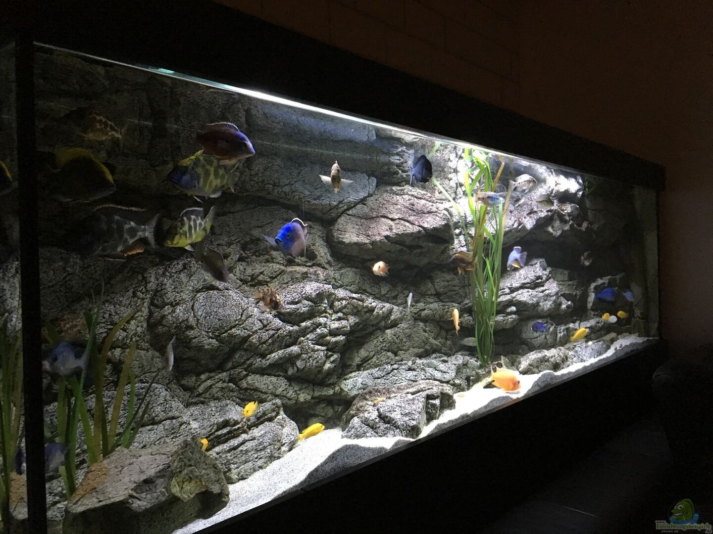 Aquarium von Aquarienkontor 12mm Glas, Kanten geschliffen. Sto??verklebung mit Sicherheitsnaht. Rückscheibe mit 15mm Glas um die Längsscheibe einzusparen (Platz für Rückwandfilter). Frontscheibe in Opti White Glas (Lichttransmission ca. 91%, Farbwiedergabeindex ca. 98%). AR-Style 3D Rückwand Alimar Grey Gneis mit Bio-Rückwandfilter. Rechte Seitenscheibe mit AR-Stone Slim-Line Rückwand. An der linken Seitenscheibe ist die Rückwand mit schwarzem Silikon verkleidet. 2 AR-Stone Module am Boden, [...]