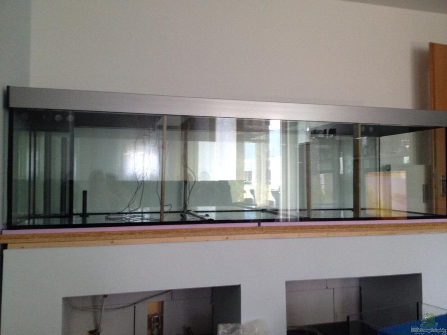 Das Becken ist eine vor Ort Verklebung der Firma Aquariumbau Ennigerloh. Die Abdeckung ist eine Sonderanfertigung von Herrn Runge komplett in Silber. aquarienabdeckungen.com 4 Bohrungen im Becken davon 2 im Filterschacht 1x für den Ablauf ins Filterbecken, 1x ein Notüberlauf ins Abwasser. Die beiden weiteren Bohrungen sind "im" Aquarium einmal ca. 10cm neben dem Filterschacht links für den Wasserwechsel, sowie 15cm vor der rechten Seite für den Rücklauf aus dem Aquarium.