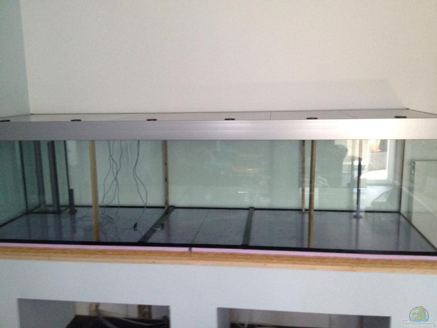 Das Becken ist eine vor Ort Verklebung der Firma Aquariumbau Ennigerloh. Die Abdeckung ist eine Sonderanfertigung von Herrn Runge komplett in Silber. aquarienabdeckungen.com 4 Bohrungen im Becken davon 2 im Filterschacht 1x für den Ablauf ins Filterbecken, 1x ein Notüberlauf ins Abwasser. Die beiden weiteren Bohrungen sind "im" Aquarium einmal ca. 10cm neben dem Filterschacht links für den Wasserwechsel, sowie 15cm vor der rechten Seite für den Rücklauf aus dem Aquarium.