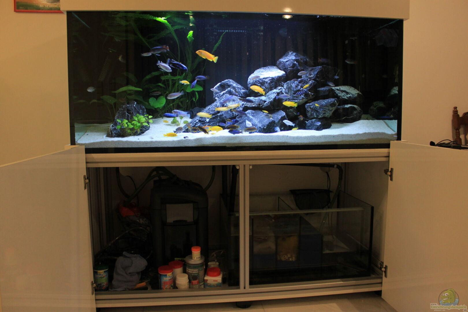 Hier findest Du traumhaft schöne Aquarien, die mit Buntbarschen der Art Nimbochromis fuscotaeniatus aus dem Malawisee besetzt sind.