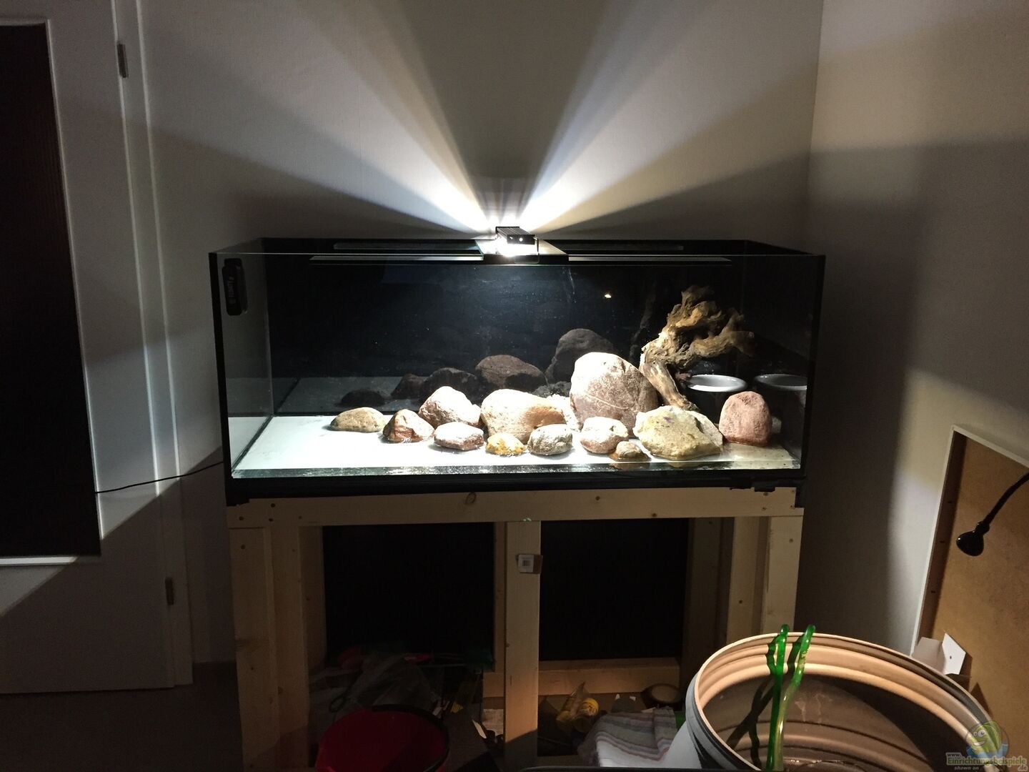 Das Aquarium habe ich bei Aquarienkontor bestellt. Es ist ein ganz normales Becken mit Sto??verklebung, ohne Bohrungen oder Wei??glas. Die Rückscheibe und die rechte Seitenscheibe habe ich von au??en mit einer schwarzen Folie aus dem Baumarkt beklebt.