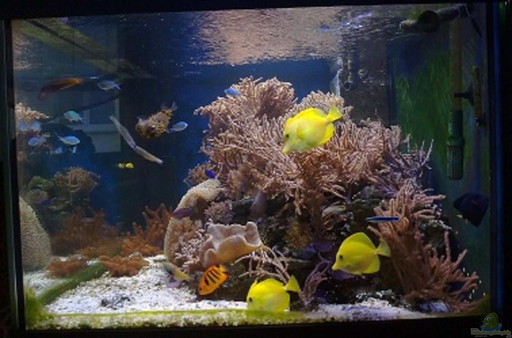 Das Becken wurde am 25.10.2010 neu eingerichtet und der Bestatz an Fischen Steinen und Korallen aus meinen vorherigen 2 Becken übernommen Zum Becken gehört noch ein 160 l Filterbecken mit 3 Kammern. In einer Kammer ist Lebendgestein und Caulerpa, in der 2. Kammer ist die Filtertechnik und die 3.Kammer dient zur Niveauregulierung