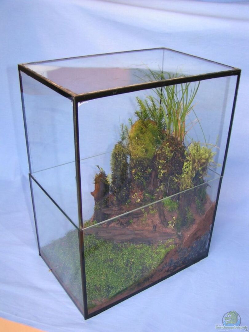 Hallo, das besondere an diesem Becken ist, dass es OHNE WASSER läuft. Tatsächlich besteht es aus zwei 12l Becken die aufeinander stehen. Darin habe ich ein Millieu geschaffen in dem Aquarienpflanzen und Moose gut emers also "über Wasser" im Gegenteil zu submers "unter Wasser" wachsen können.