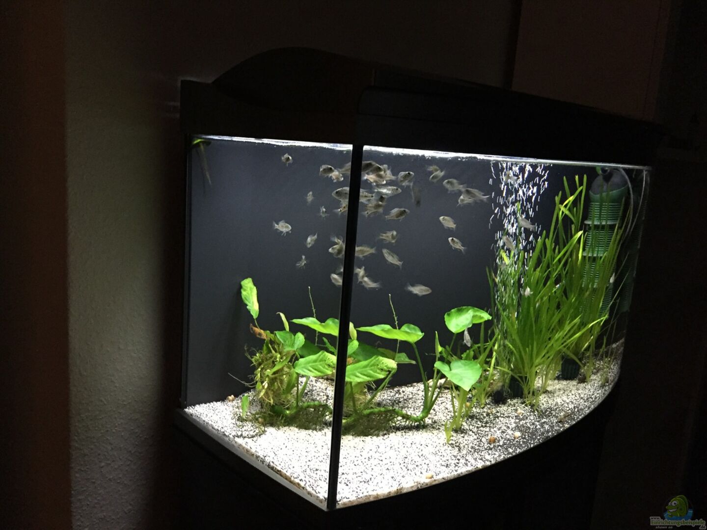 Tetra AquaArt Evolution Line mit Standard Beleuchtung. Dieses Becken dient als Quarantäne/Aufzucht und Pflanzenregenerations-Becken je nach dem was gerade ansteht. Aktuell sind Aulonocara Junge zur Aufzucht im Becken.