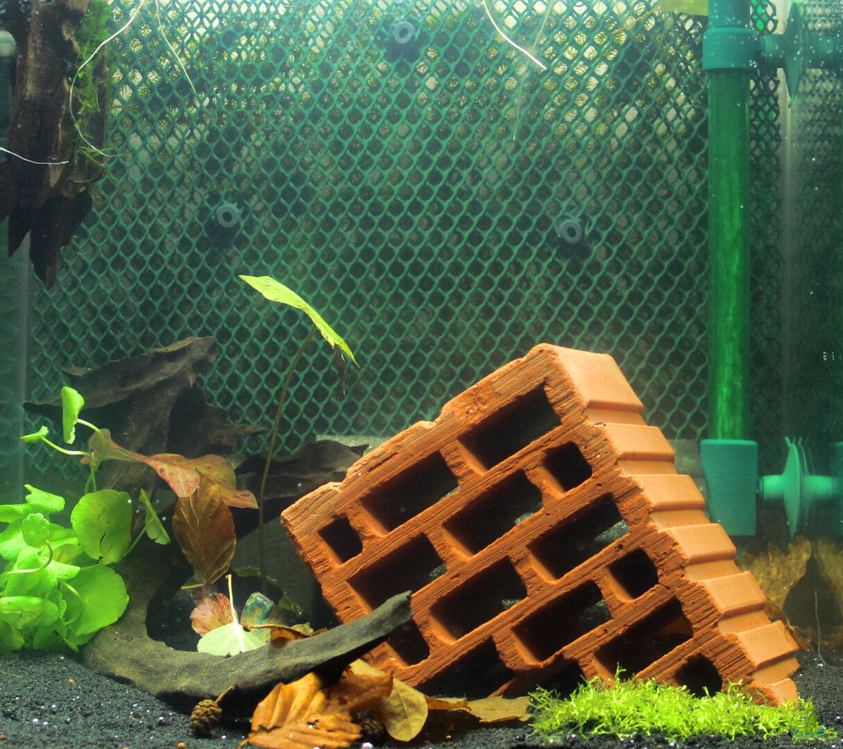 Moosrückwand Dazu habe ich 2 Moosgitter aufeinander gelegt, das Moos (Phönix Moos) dazwischen geklemmt, und anschlie??end die beiden Matten zusammengeschnürt. Befestigt ist es mit Saugnäpfen an der Aquarienscheibe.