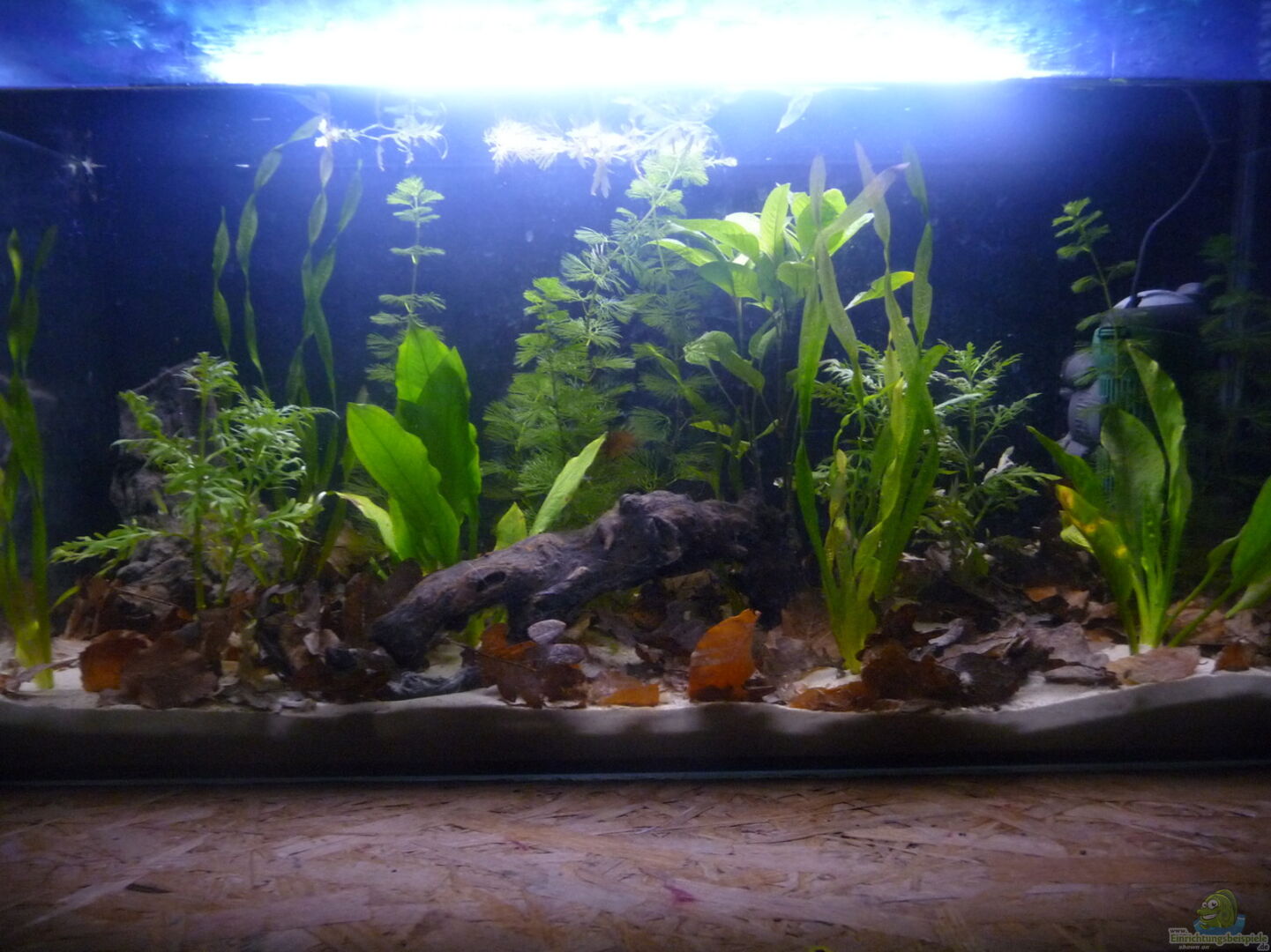 Das Aquarium ist anstatt einer herkömmlichen Abdeckung mit einer Glasscheibe abgedeckt, die Leuchtstoffröhre liegt direkt auf der Abdeckscheibe. Darüber ist eine selbtgebaute Lichtblende aus schwarzen Holzleisten, die innen mit Alufolie beklebt ist.
