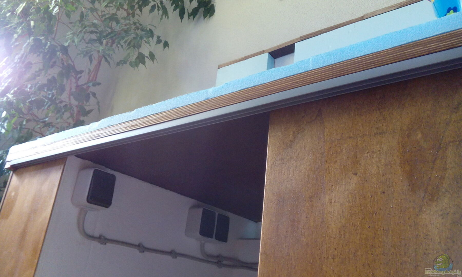 Das Becken wurde nach Bleistiftzeichnung von der Firma Aquarienkontor.de gefertigt. Es hat eine eingeklebte Halterung für einen Mattenfilter an der Rückwand und ist rundum verstrebt mit 2 Brücken. Der Unterbau ist selbstgebaut aus Siebdruckplatten, Ytong-Steinen und Sperrholz. Meine Idee war kein Wasser aus dem Becken zu leiten. Als Kompromiss befindet sich der UV-C Klärer darüber, das bei Undichtigkeit das Wasser wieder im Becken landet. Die Rückwand ist mit schwarzer Abtönfarbe gestrichen. [...]