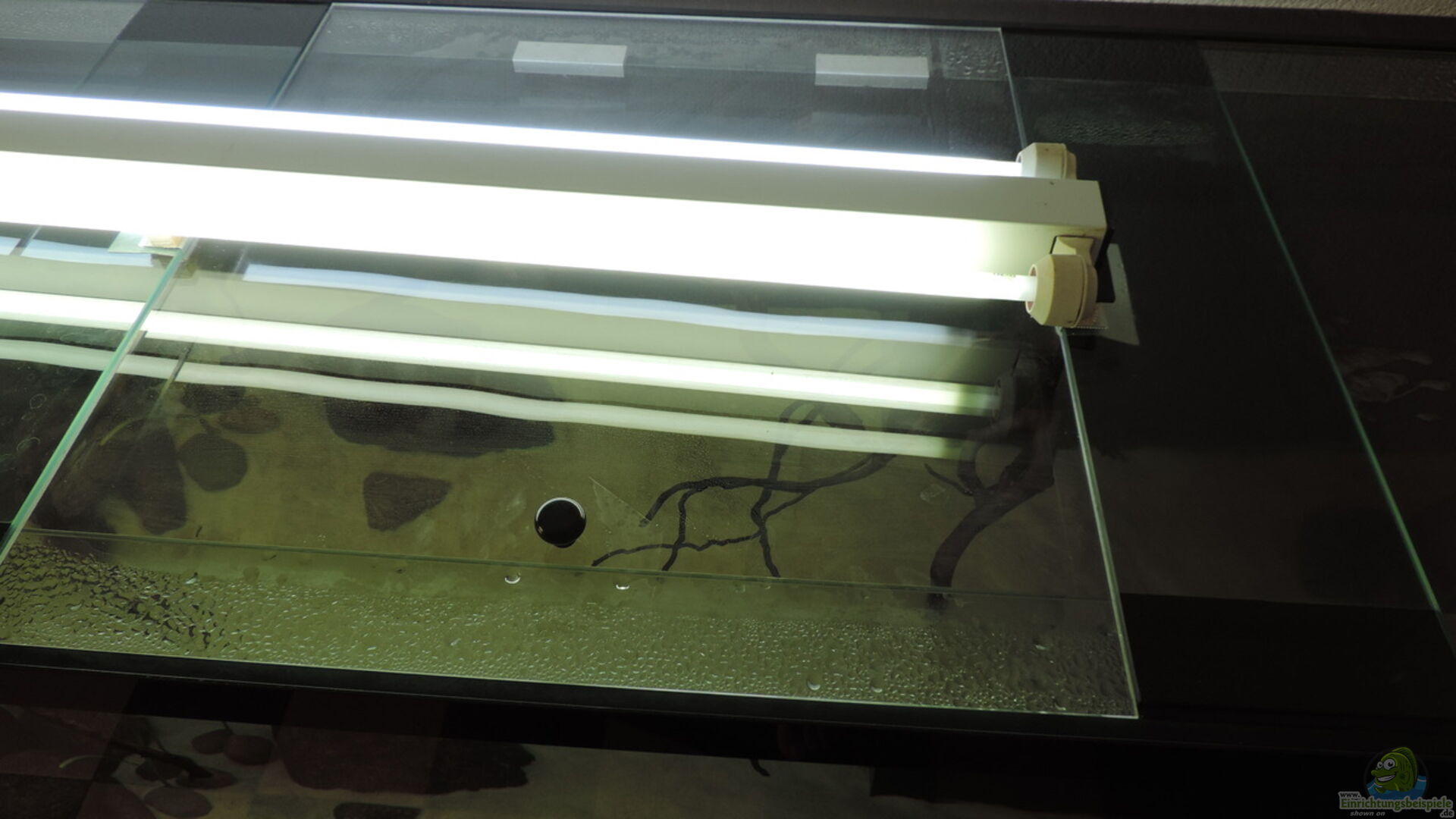 Das Becken wurde nach Bleistiftzeichnung von der Firma Aquarienkontor.de gefertigt. Es hat eine eingeklebte Halterung für einen Mattenfilter an der Rückwand und ist rundum verstrebt mit 2 Brücken. Der Unterbau ist selbstgebaut aus Siebdruckplatten, Ytong-Steinen und Sperrholz. Meine Idee war kein Wasser aus dem Becken zu leiten. Als Kompromiss befindet sich der UV-C Klärer darüber, das bei Undichtigkeit das Wasser wieder im Becken landet. Die Rückwand ist mit schwarzer Abtönfarbe gestrichen. [...]