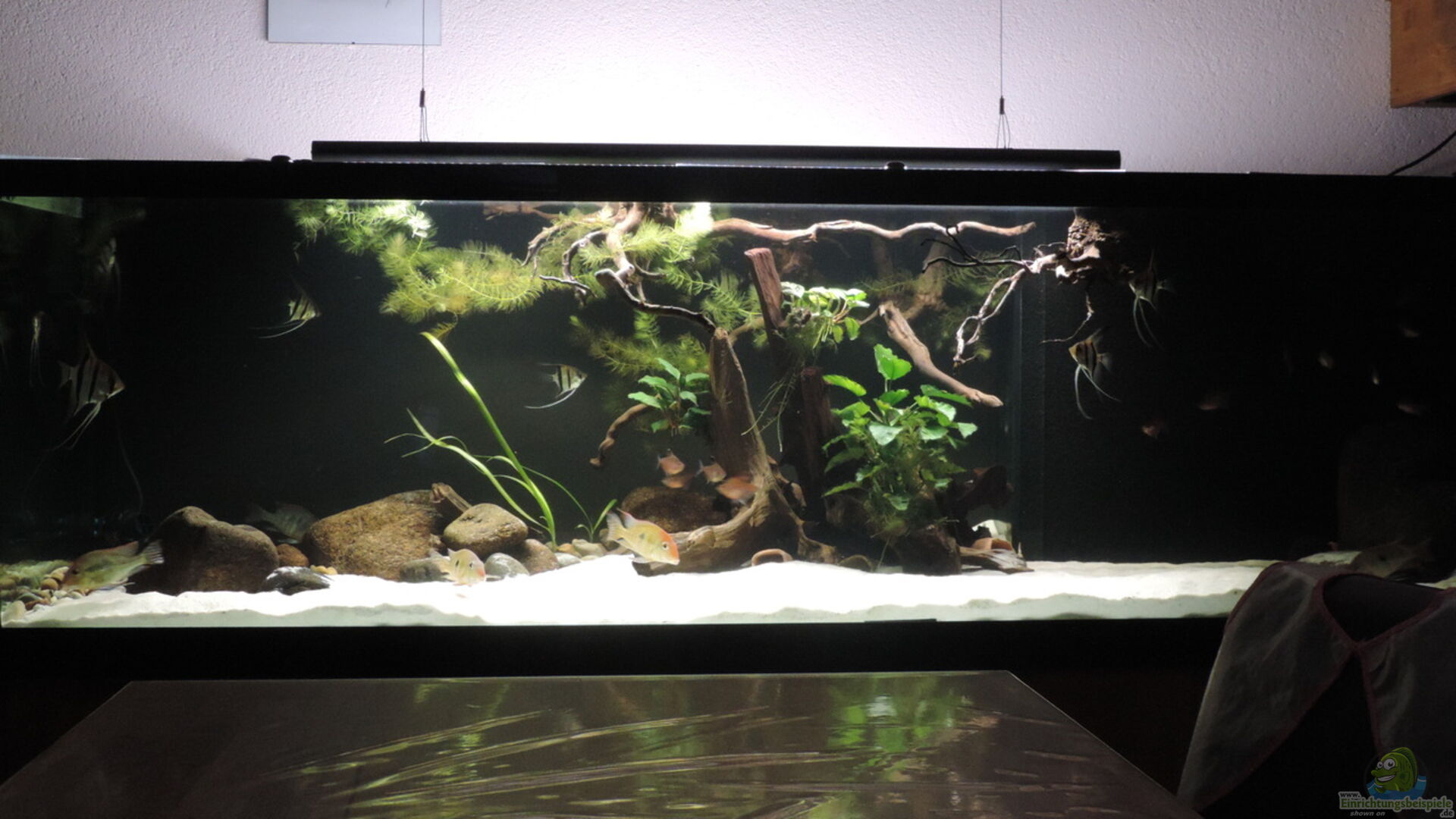 Das Becken wurde nach Bleistiftzeichnung von der Firma Aquarienkontor.de gefertigt. Es hat eine eingeklebte Halterung für einen Mattenfilter an der Rückwand und ist rundum verstrebt mit 2 Brücken. Der Unterbau ist selbstgebaut aus Siebdruckplatten, Ytong-Steinen und Sperrholz. Meine Idee war kein Wasser aus dem Becken zu leiten. Als Kompromiss befindet sich der UV-C Klärer darüber, das bei Undichtigkeit das Wasser wieder im Becken landet. Die Rückwand ist mit schwarzer Abtönfarbe gestrichen. [...]