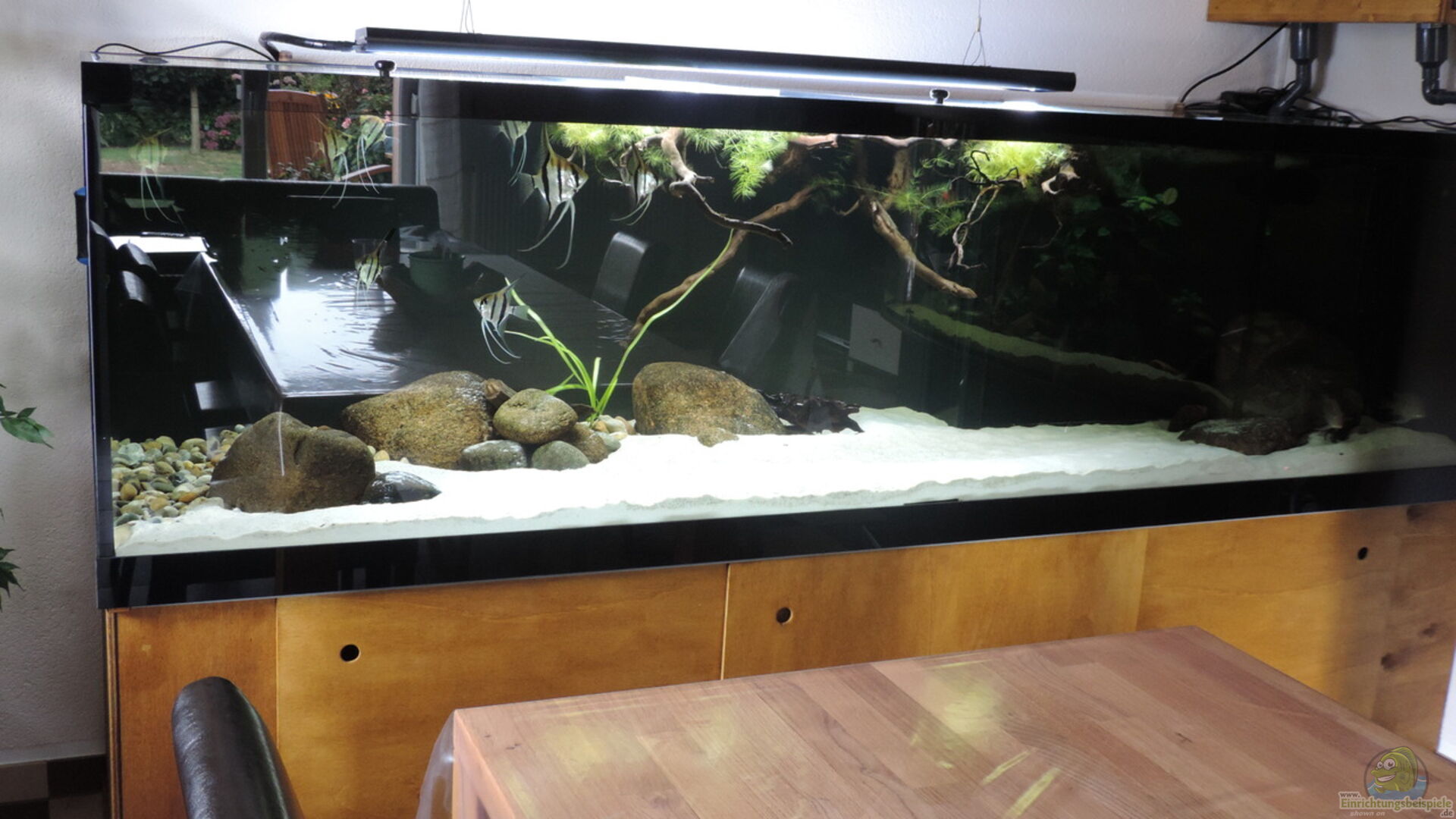Das Becken wurde nach Bleistiftzeichnung von der Firma Aquarienkontor.de gefertigt. Es hat eine eingeklebte Halterung für einen Mattenfilter an der Rückwand und ist rundum verstrebt mit 2 Brücken. Der Unterbau ist selbstgebaut aus Siebdruckplatten, Ytong-Steinen und Sperrholz. Meine Idee war kein Wasser aus dem Becken zu leiten. Als Kompromiss befindet sich der UV-C Klärer darüber, das bei Undichtigkeit das Wasser wieder im Becken landet. Die Rückwand ist mit schwarzer Abtönfarbe gestrichen. [...]