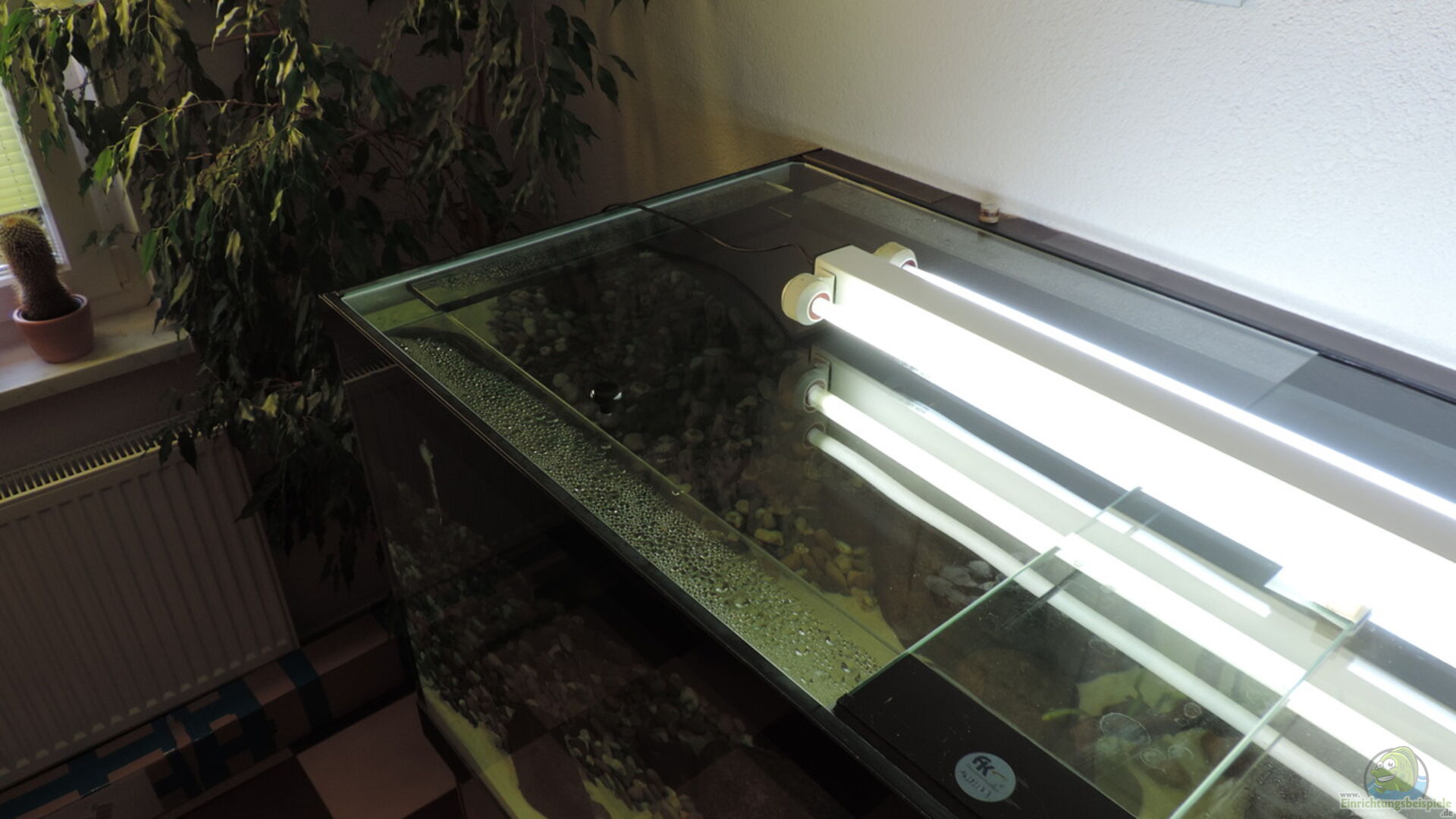 Das Becken wurde nach Bleistiftzeichnung von der Firma Aquarienkontor.de gefertigt. Es hat eine eingeklebte Halterung für einen Mattenfilter an der Rückwand und ist rundum verstrebt mit 2 Brücken. Der Unterbau ist selbstgebaut aus Siebdruckplatten, Ytong-Steinen und Sperrholz. Meine Idee war kein Wasser aus dem Becken zu leiten. Als Kompromiss befindet sich der UV-C Klärer darüber, das bei Undichtigkeit das Wasser wieder im Becken landet. Die Rückwand ist mit schwarzer Abtönfarbe gestrichen. [...]