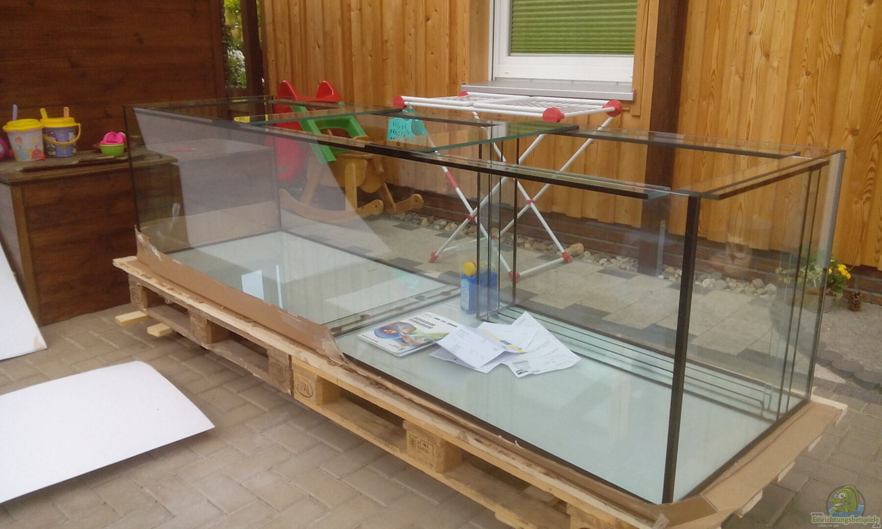 Das Becken wurde nach Bleistiftzeichnung von der Firma Aquarienkontor.de gefertigt. Es hat eine eingeklebte Halterung für einen Mattenfilter an der Rückwand und ist rundum verstrebt mit 2 Brücken. Der Unterbau ist selbstgebaut aus Siebdruckplatten, Ytong-Steinen und Sperrholz. Meine Idee war kein Wasser aus dem Becken zu leiten. Als Kompromiss befindet sich der UV-C Klärer darüber, das bei Undichtigkeit das Wasser wieder im Becken landet. Die Rückwand ist mit schwarzer Abtönfarbe gestrichen. [...]