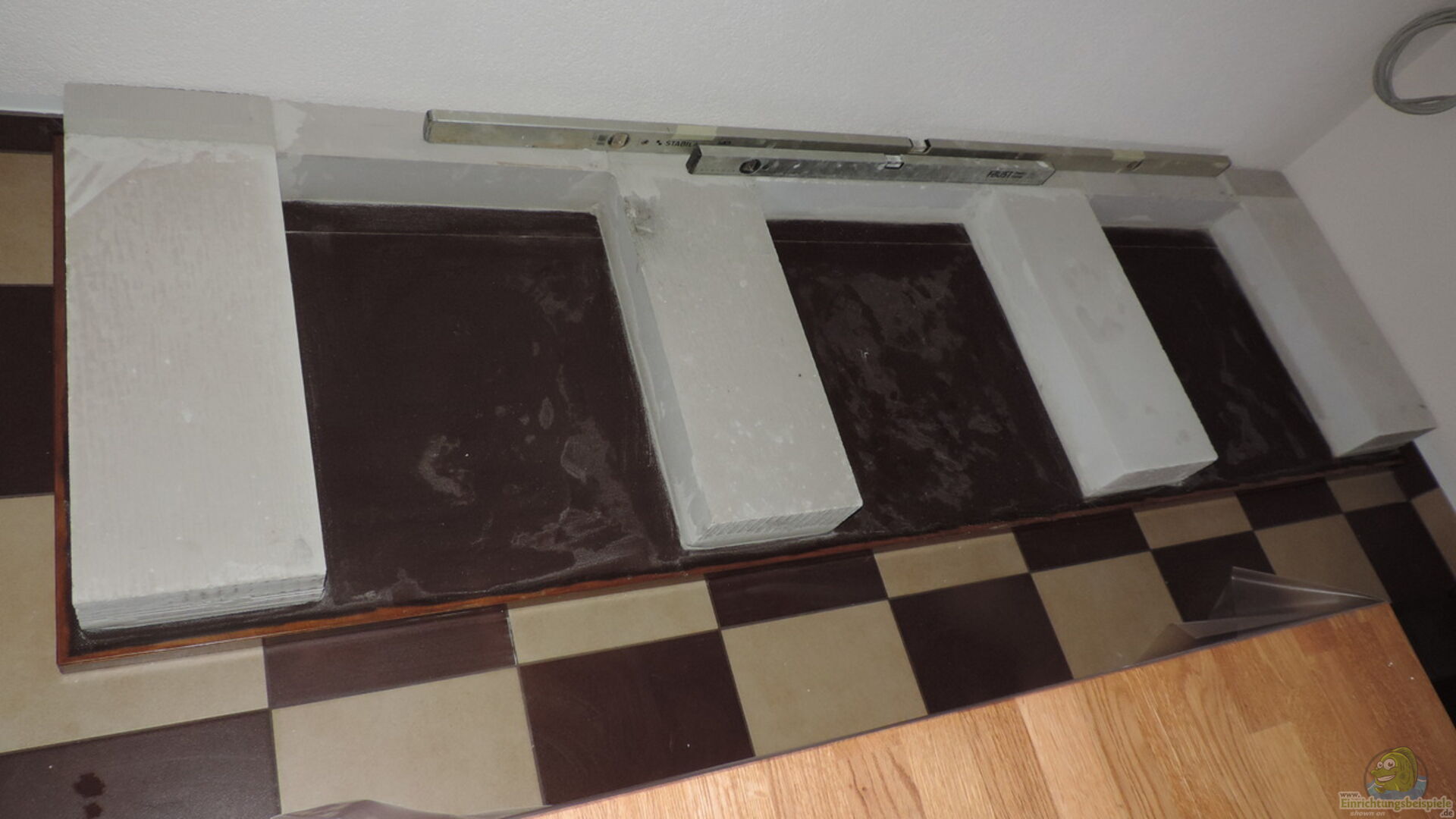 Das Becken wurde nach Bleistiftzeichnung von der Firma Aquarienkontor.de gefertigt. Es hat eine eingeklebte Halterung für einen Mattenfilter an der Rückwand und ist rundum verstrebt mit 2 Brücken. Der Unterbau ist selbstgebaut aus Siebdruckplatten, Ytong-Steinen und Sperrholz. Meine Idee war kein Wasser aus dem Becken zu leiten. Als Kompromiss befindet sich der UV-C Klärer darüber, das bei Undichtigkeit das Wasser wieder im Becken landet. Die Rückwand ist mit schwarzer Abtönfarbe gestrichen. [...]