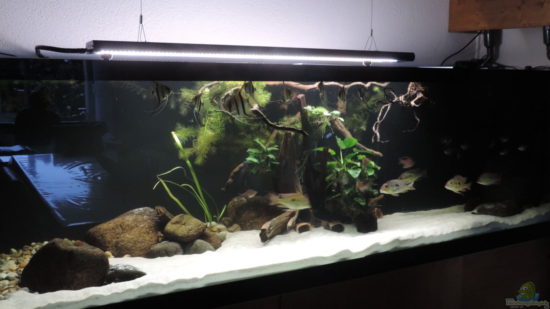 Das Becken wurde nach Bleistiftzeichnung von der Firma Aquarienkontor.de gefertigt. Es hat eine eingeklebte Halterung für einen Mattenfilter an der Rückwand und ist rundum verstrebt mit 2 Brücken. Der Unterbau ist selbstgebaut aus Siebdruckplatten, Ytong-Steinen und Sperrholz. Meine Idee war kein Wasser aus dem Becken zu leiten. Als Kompromiss befindet sich der UV-C Klärer darüber, das bei Undichtigkeit das Wasser wieder im Becken landet. Die Rückwand ist mit schwarzer Abtönfarbe gestrichen. [...]