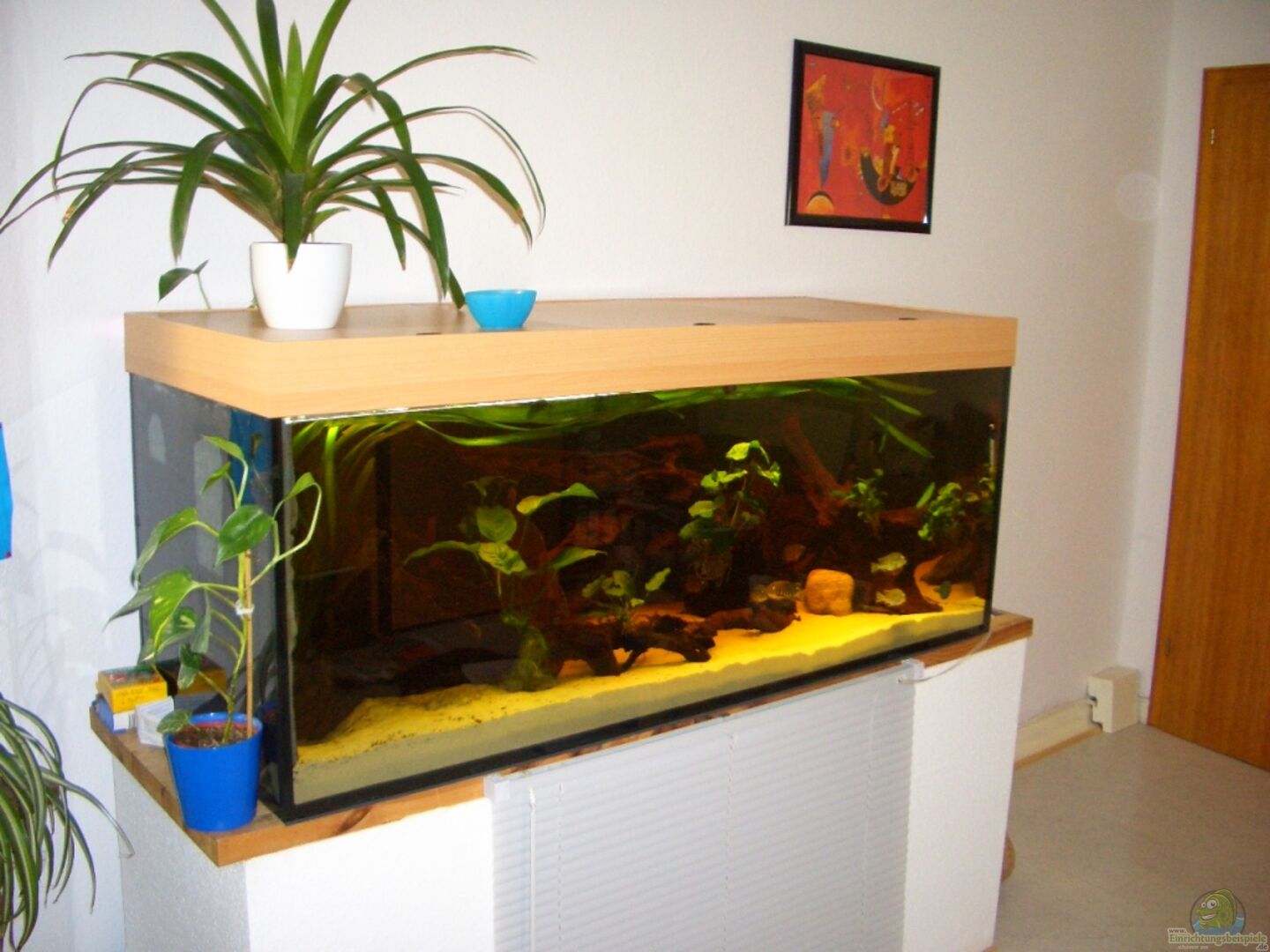 Der Unterschranck wurde gebraucht gekauft.Er besteht aus einem Rohrahmen, geschwei??t und mit Hammerrit Farbe lackiert. An den Rändern ist zusätzlich eine Holzverlattung angebracht. Der Unterschranck ist mit MDF-Platten verkleidet, die mit Rauhfaser beklebt wurden, die wei?? gestrichen wurden. Vorne ist als Zugang zu der Technik ein wei??es Faltrollo angebracht. Das Becken steht auf einer 4cm straken Leimholzplatte die 180x60 misst.