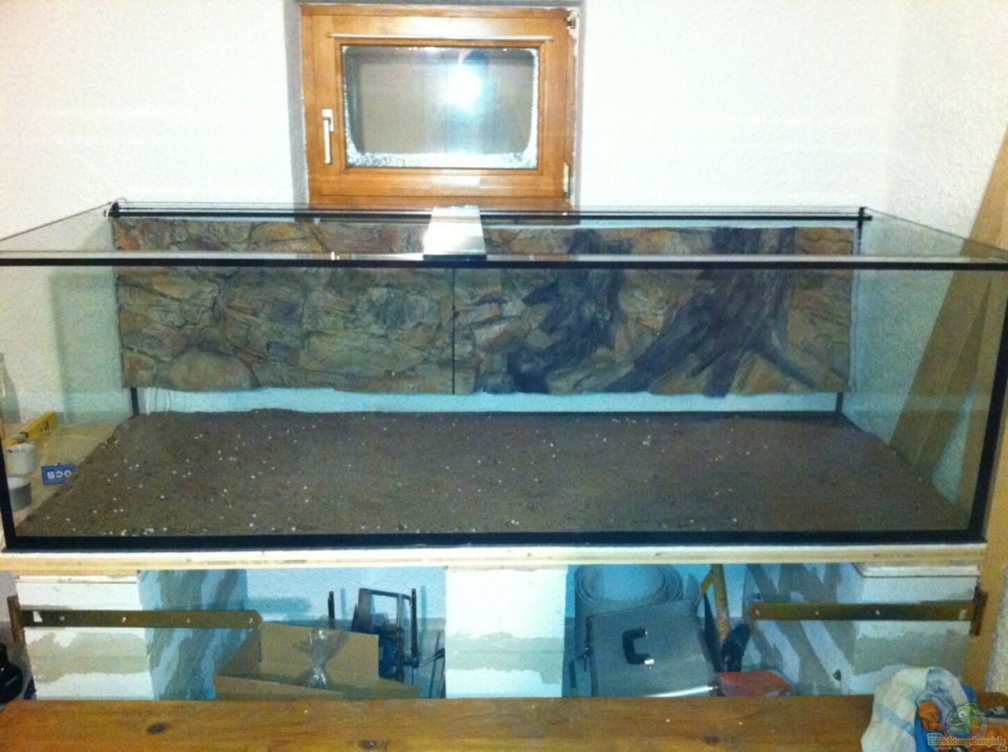 Becken ist aus 12mm Floatglas. 2 teilige Bodenplatte. Sto??verklebt + Sicherheitsnaht. Eingeklebte 3D Rückwand Abdeckung aus 6mm Plexiglasscheiben. Das Aquarium steht im Keller in einem extra Raum, der zum Aquarien - Zimmer umfunktioniert wurde :) Becken wird komplett mit Holz oder wei??em Alublech verkleidet. Links neben dem Becken wird sich dann ein "Technikschrank" befinden, worin die ganze Steuerung, PC, PH- Controller, Co2 Controller usw untergbracht wird [...]