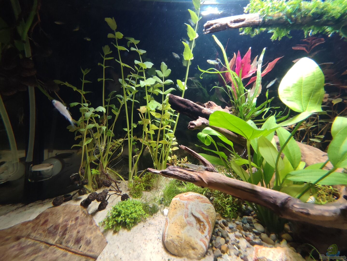 Das Becken wird mit einem Oase Filter 100 gefiltert. Eine 200 Watt Heizung sorgt für ca. 24-25 Grad. Eine CO 2 Anlage ist installiert. Der Schrank ist Marke eigenbau und mit Styropor isoliert. Das besteht aus 2 fluval Led Leuchtmittel. Diese werden unterschiedlich über eine Steuerung eingeschaltet. Ca 8-10 Stunden wird beleuchtet.