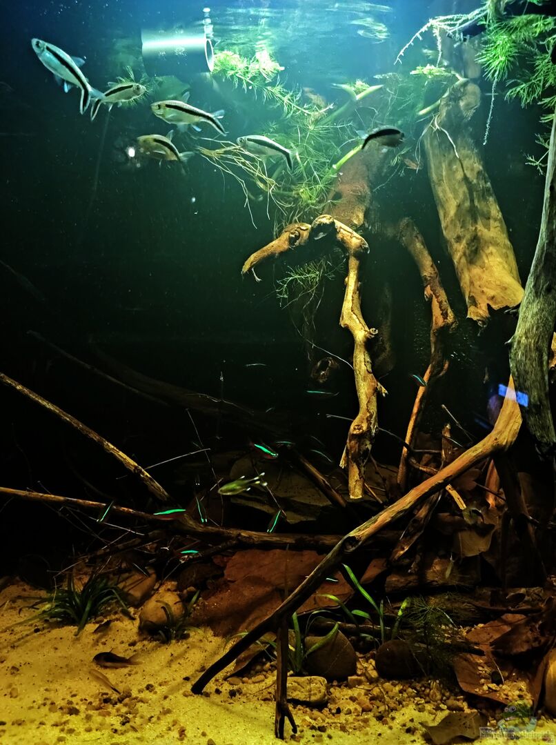 Dieses Becken soll ein kleiner Ausschnitt aus einem Nebenarm des Rio Negros (Uferbereich) darstellen. Ich habe versucht, dies so naturgetreu wie möglich nachzuarmen. Die Grundidee hinter der Aquariumeinrichtung war ein kleiner Nebenfluss am Ufer nachzustellen. Um diese Optik in meinem Aquarium zu kreieren, wurde besonders auf die Echtheit der Natur geachtet. Dafür bieten die zwei Wurzeln, die in das Aquarium ragen, einen zusätzlichen Schutz für die Fische während sie sich im Uferbereich aufhalten. [...]
