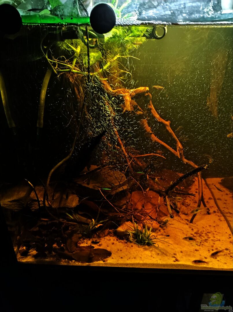 Dieses Becken soll ein kleiner Ausschnitt aus einem Nebenarm des Rio Negros (Uferbereich) darstellen. Ich habe versucht, dies so naturgetreu wie möglich nachzuarmen. Die Grundidee hinter der Aquariumeinrichtung war ein kleiner Nebenfluss am Ufer nachzustellen. Um diese Optik in meinem Aquarium zu kreieren, wurde besonders auf die Echtheit der Natur geachtet. Dafür bieten die zwei Wurzeln, die in das Aquarium ragen, einen zusätzlichen Schutz für die Fische während sie sich im Uferbereich aufhalten. [...]