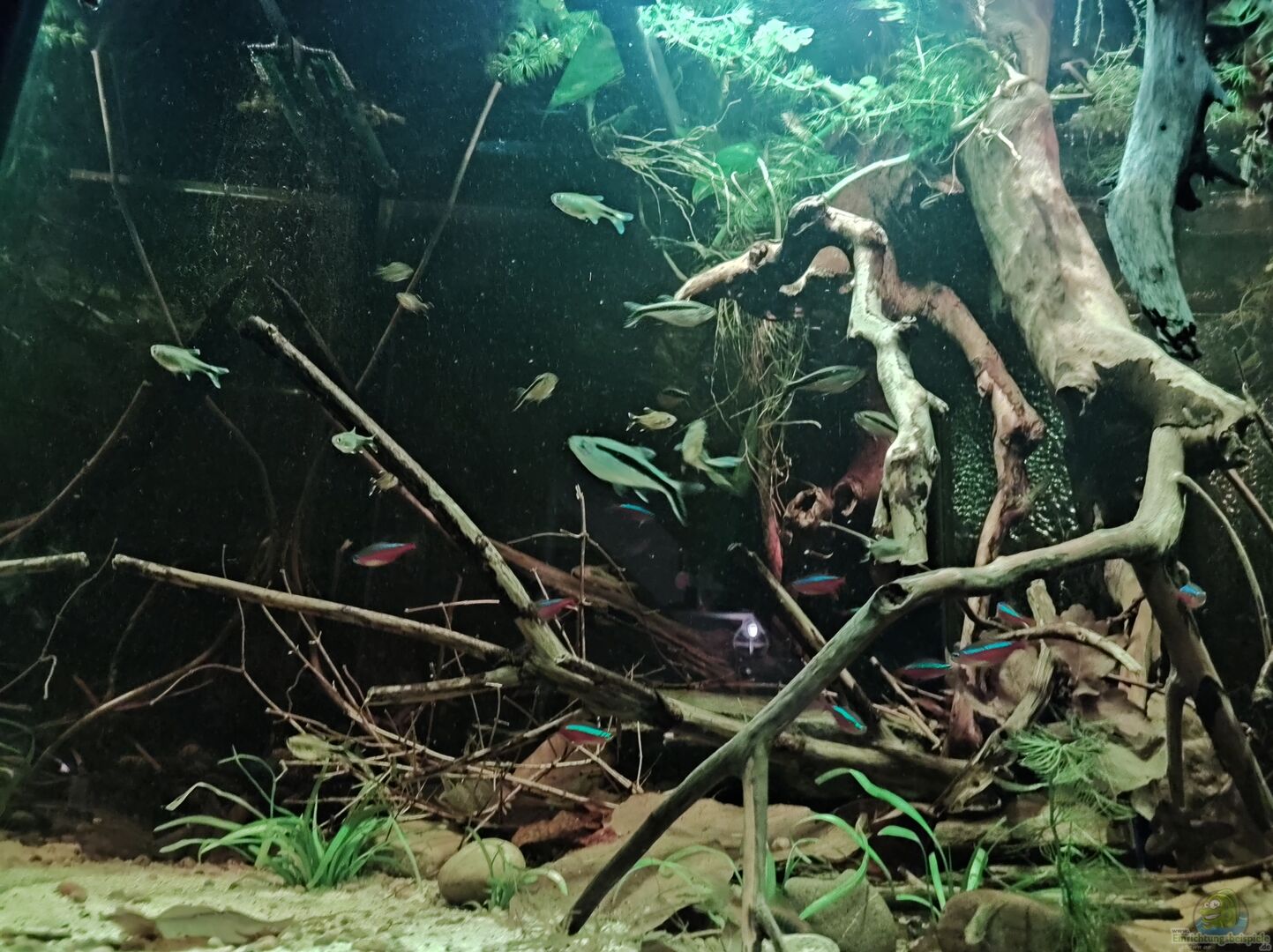 Dieses Becken soll ein kleiner Ausschnitt aus einem Nebenarm des Rio Negros (Uferbereich) darstellen. Ich habe versucht, dies so naturgetreu wie möglich nachzuarmen. Die Grundidee hinter der Aquariumeinrichtung war ein kleiner Nebenfluss am Ufer nachzustellen. Um diese Optik in meinem Aquarium zu kreieren, wurde besonders auf die Echtheit der Natur geachtet. Dafür bieten die zwei Wurzeln, die in das Aquarium ragen, einen zusätzlichen Schutz für die Fische während sie sich im Uferbereich aufhalten. [...]
