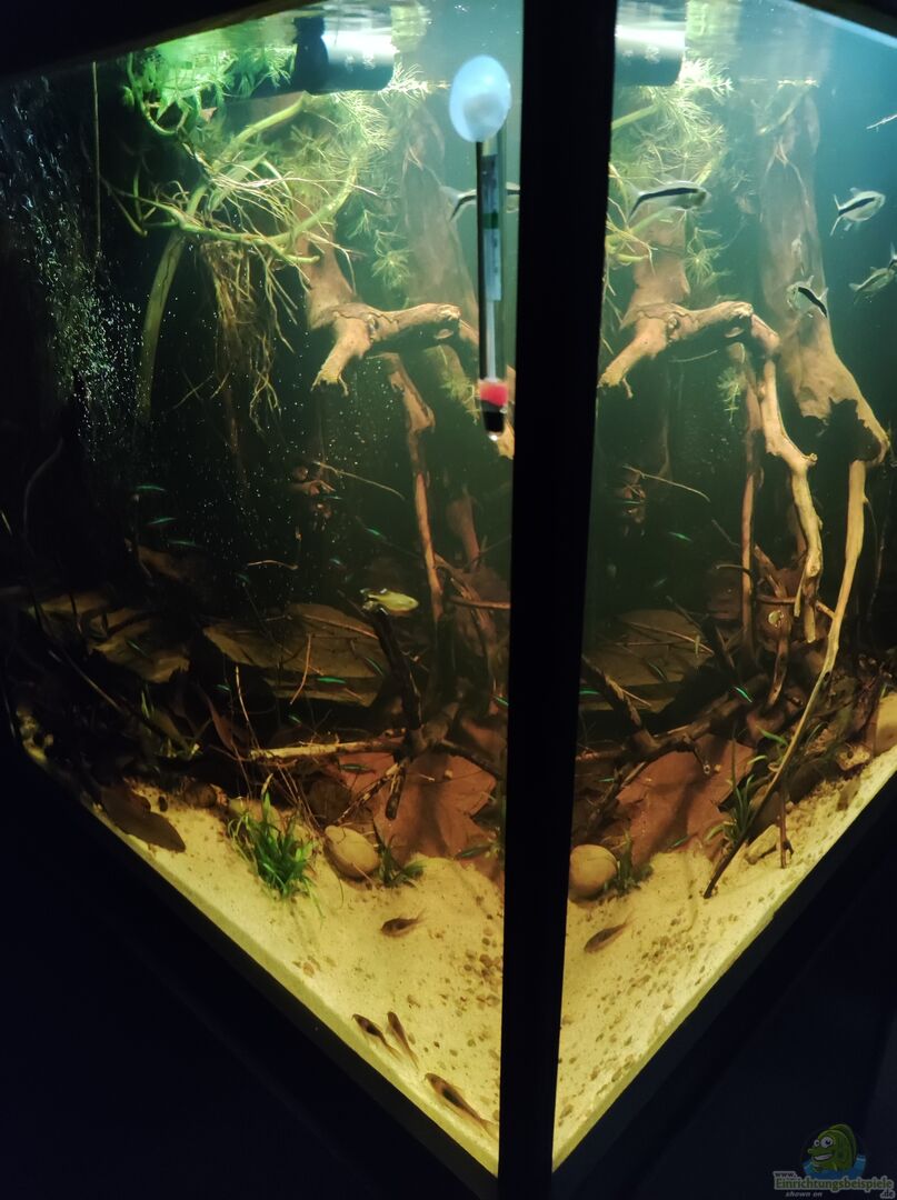 Dieses Becken soll ein kleiner Ausschnitt aus einem Nebenarm des Rio Negros (Uferbereich) darstellen. Ich habe versucht, dies so naturgetreu wie möglich nachzuarmen. Die Grundidee hinter der Aquariumeinrichtung war ein kleiner Nebenfluss am Ufer nachzustellen. Um diese Optik in meinem Aquarium zu kreieren, wurde besonders auf die Echtheit der Natur geachtet. Dafür bieten die zwei Wurzeln, die in das Aquarium ragen, einen zusätzlichen Schutz für die Fische während sie sich im Uferbereich aufhalten. [...]