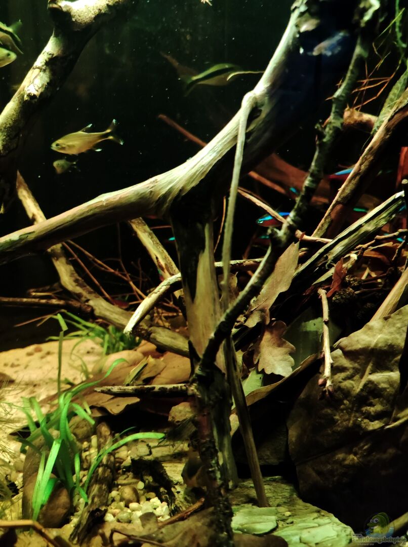 Dieses Becken soll ein kleiner Ausschnitt aus einem Nebenarm des Rio Negros (Uferbereich) darstellen. Ich habe versucht, dies so naturgetreu wie möglich nachzuarmen. Die Grundidee hinter der Aquariumeinrichtung war ein kleiner Nebenfluss am Ufer nachzustellen. Um diese Optik in meinem Aquarium zu kreieren, wurde besonders auf die Echtheit der Natur geachtet. Dafür bieten die zwei Wurzeln, die in das Aquarium ragen, einen zusätzlichen Schutz für die Fische während sie sich im Uferbereich aufhalten. [...]